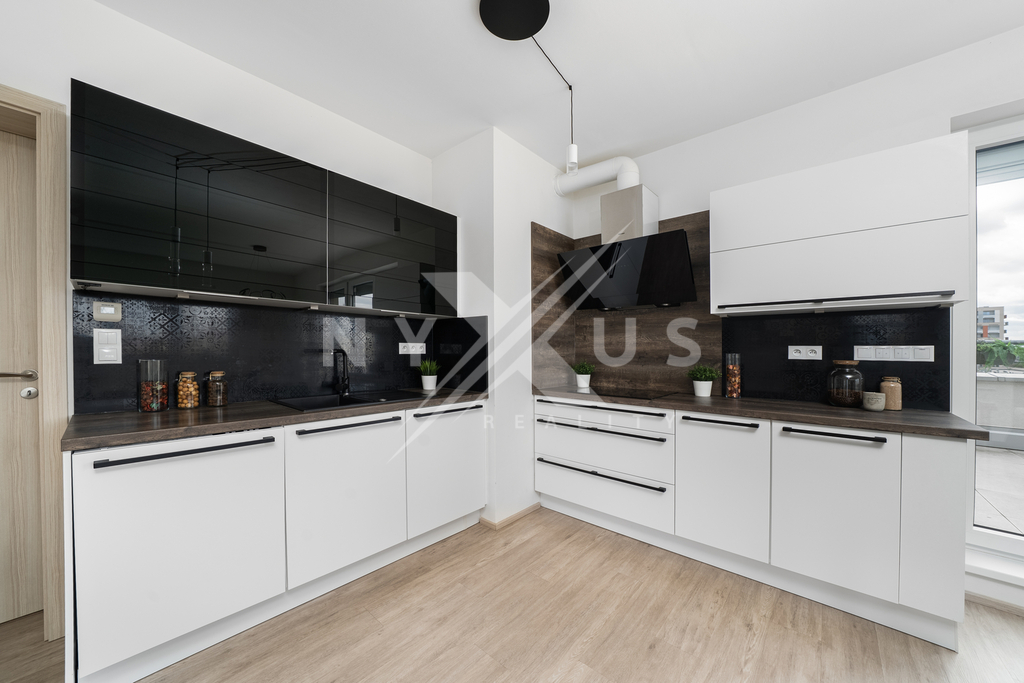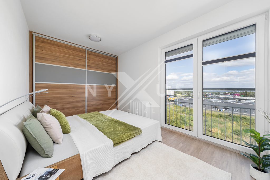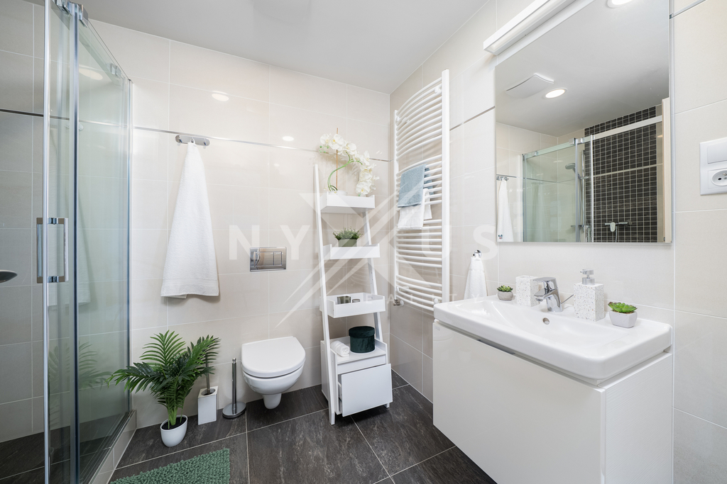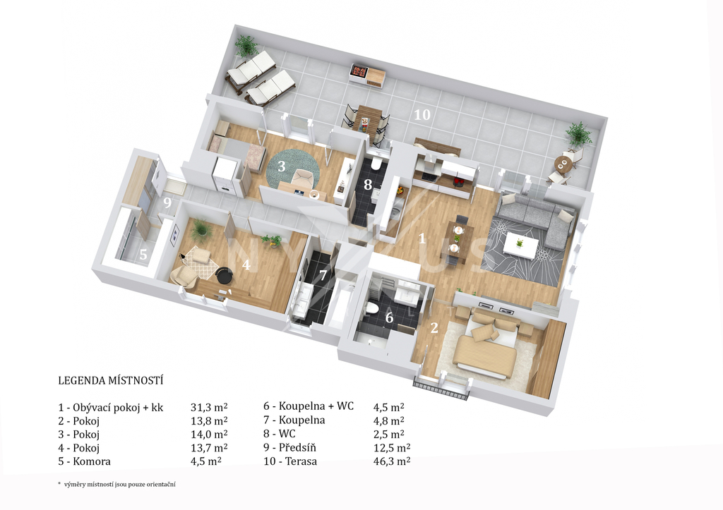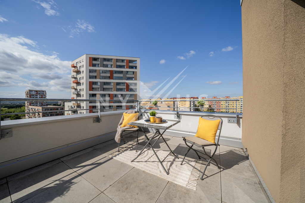 Dominantou bytu je prostorný obývací pokoj s kuchyňským koutem a přímým vstupem na terasu, která propojuje interiér s exteriérem. K dispozici jsou také tři ložnice, dvě koupelny a dvě toalety. První koupelna je vybavena sprchovým koutem a toaletou, druhá koupelna nabízí vanu, toaleta je řešena samostatně. Vstupní hala poskytuje dostatek prostoru a komfortu.