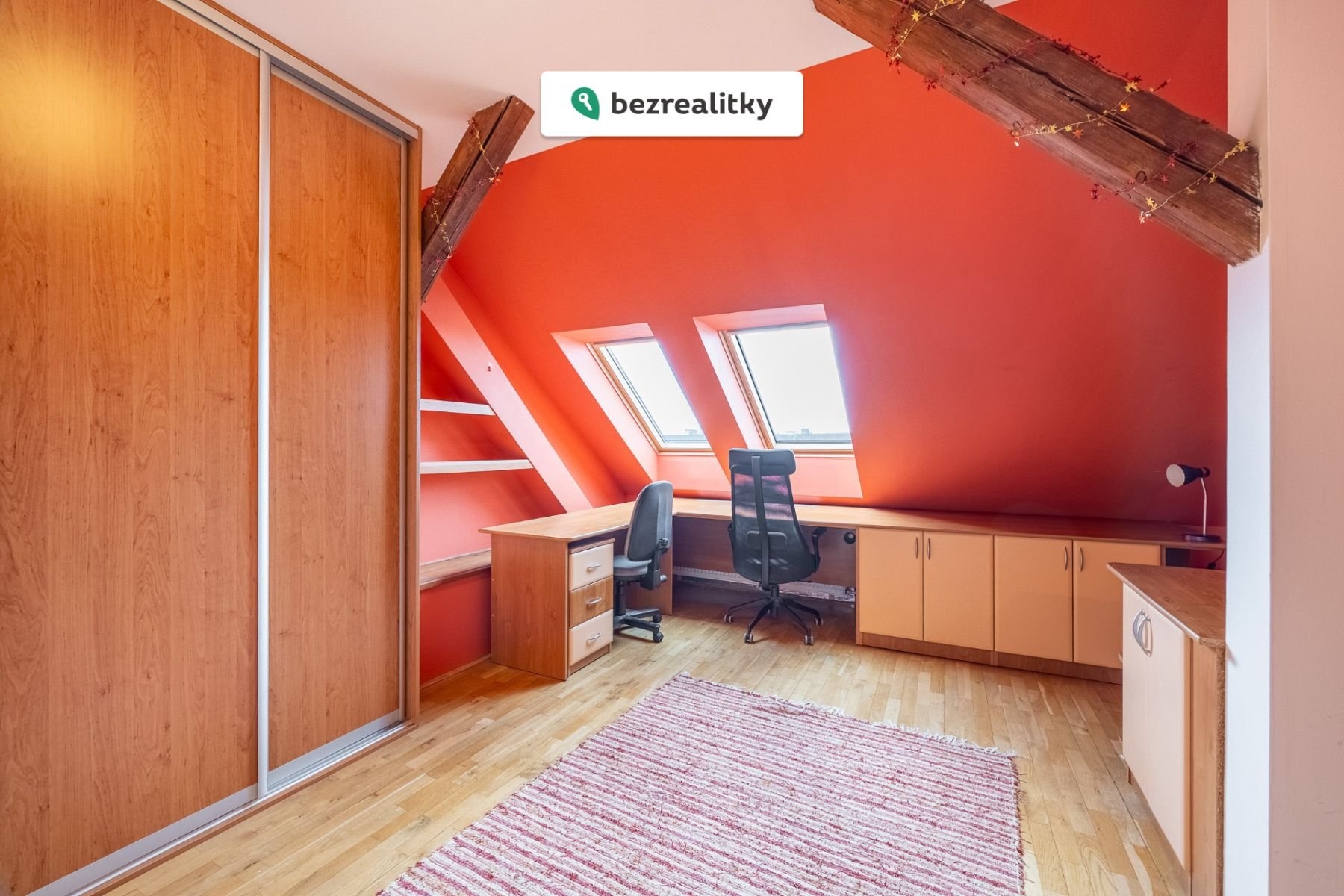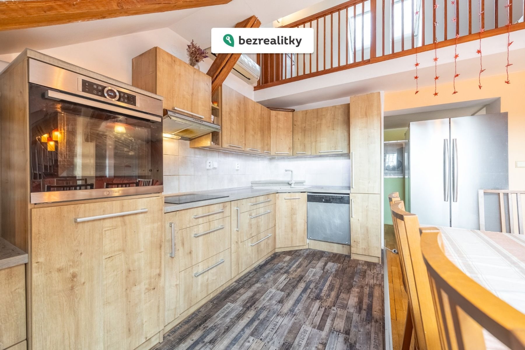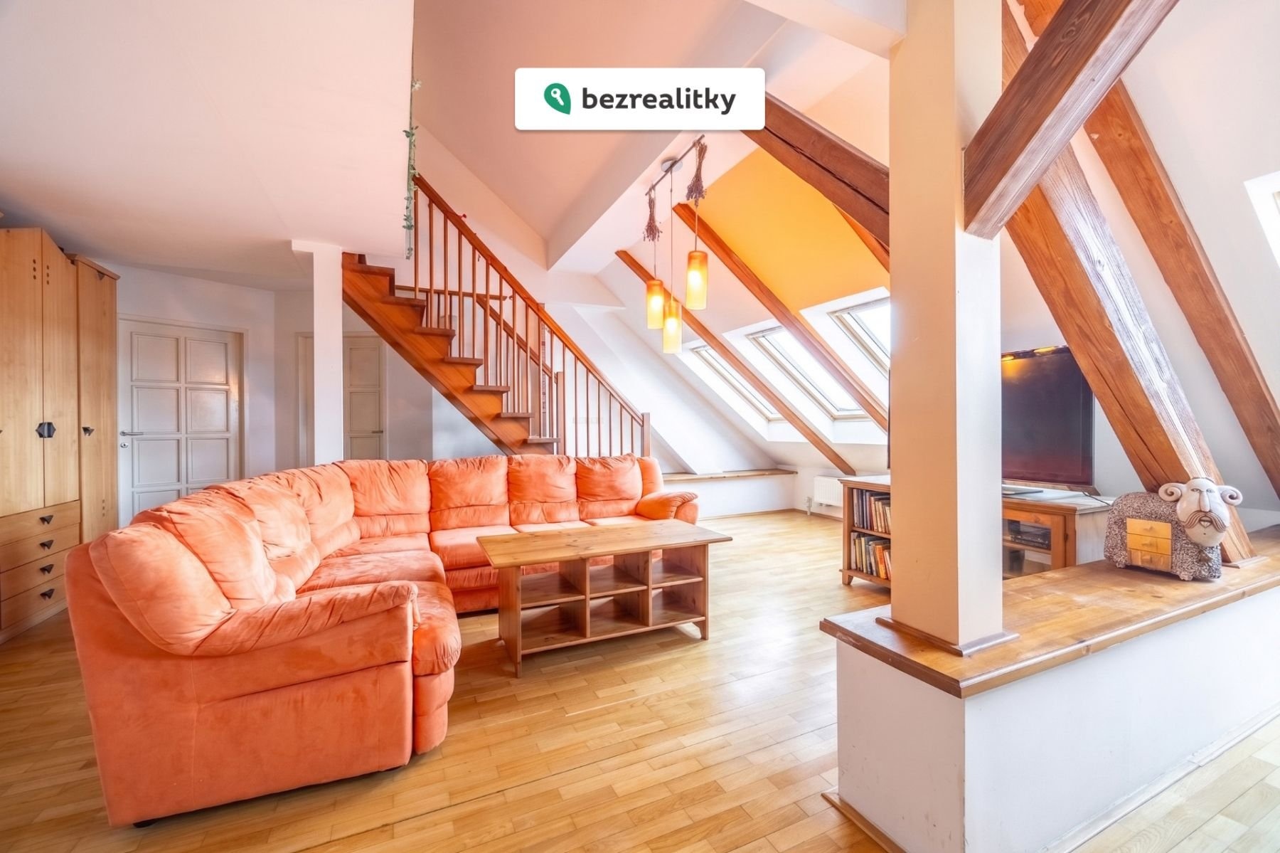 Dominantou bytu je velkorysý otevřený obývací prostor s kuchyní, který působí díky podkrovní architektuře mimořádně světlým a vzdušným dojmem. Otevřený strop, přirozené světlo a plynulé propojení jednotlivých částí vytvářejí ideální místo pro rodinný život i reprezentativní setkávání s přáteli.
