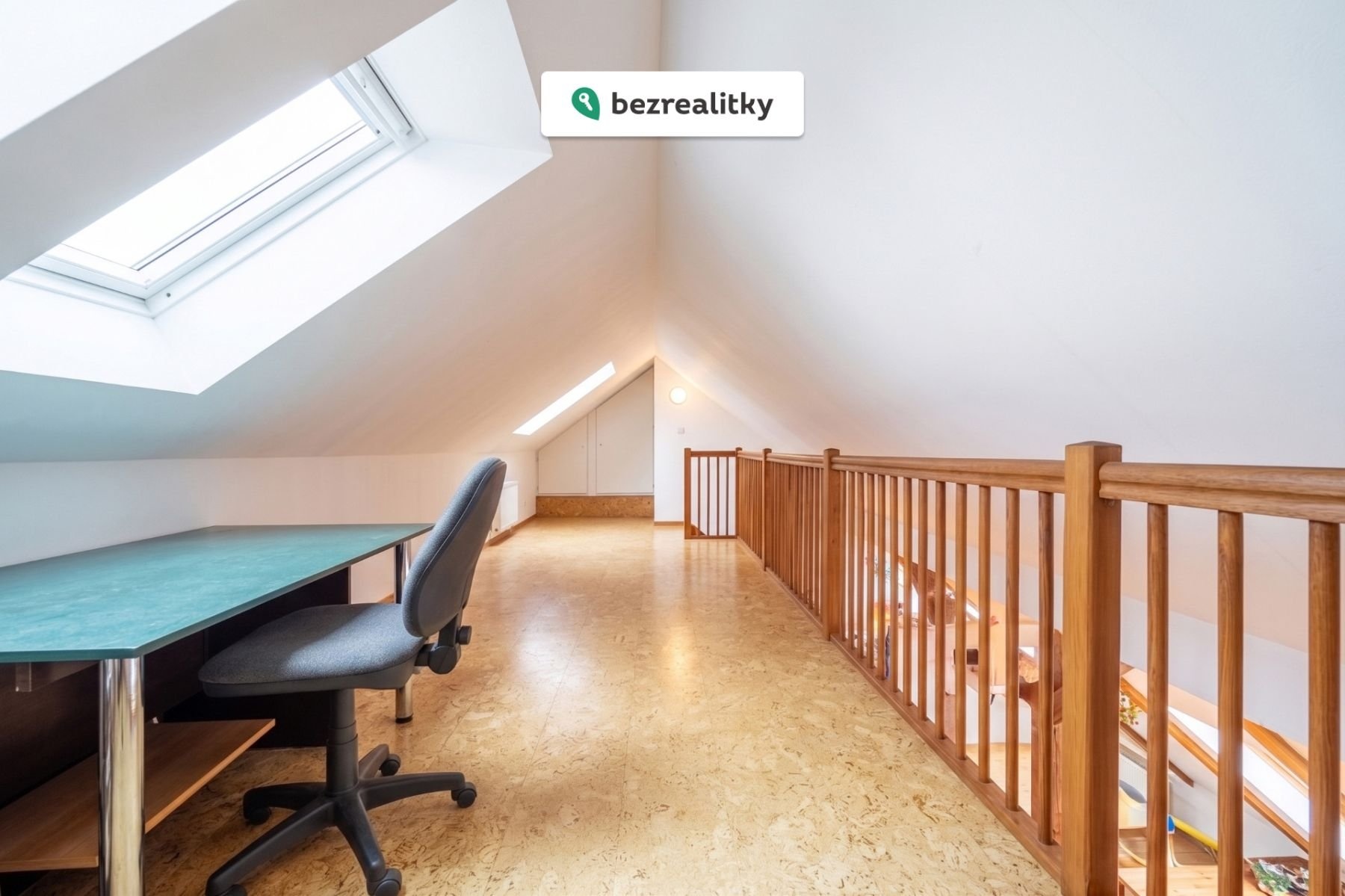 Z obývací části vede schodiště do dalšího otevřeného patra, které nabízí flexibilní využití – pracovní zázemí, relaxační zónu, hernu nebo další úložné prostory. Na tomto patře se nacházejí také dvě praktické komory.
