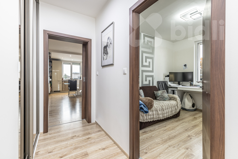 Dispozice bytu je prakticky řešena s důrazem na oddělení denní a klidové části. Dominantou je obývací pokoj s kuchyňským koutem o velikosti 29,23 m2 s přímým vstupem na prostornou terasu. Ložnice má výměru 13,35 m², další pokoje 15,89 m2 a 9,95 m2. Koupelna disponuje plochou 3,39 m2, samostatné WC 1,41 m2. Komfort užívání doplňuje prostorná chodba 14,43 m2 a praktická komora 3,85 m2 přímo v bytě. Byt se nachází v posledním podlaží, což zajišťuje větší míru soukromí a klidné bydlení.