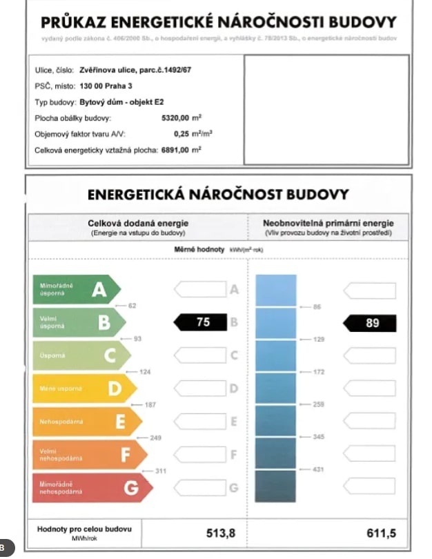 - Ukazatel energetické náročnosti budovy: 75 kWh/m²