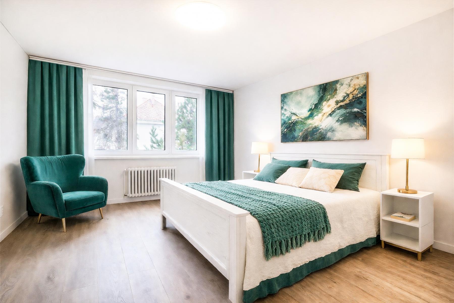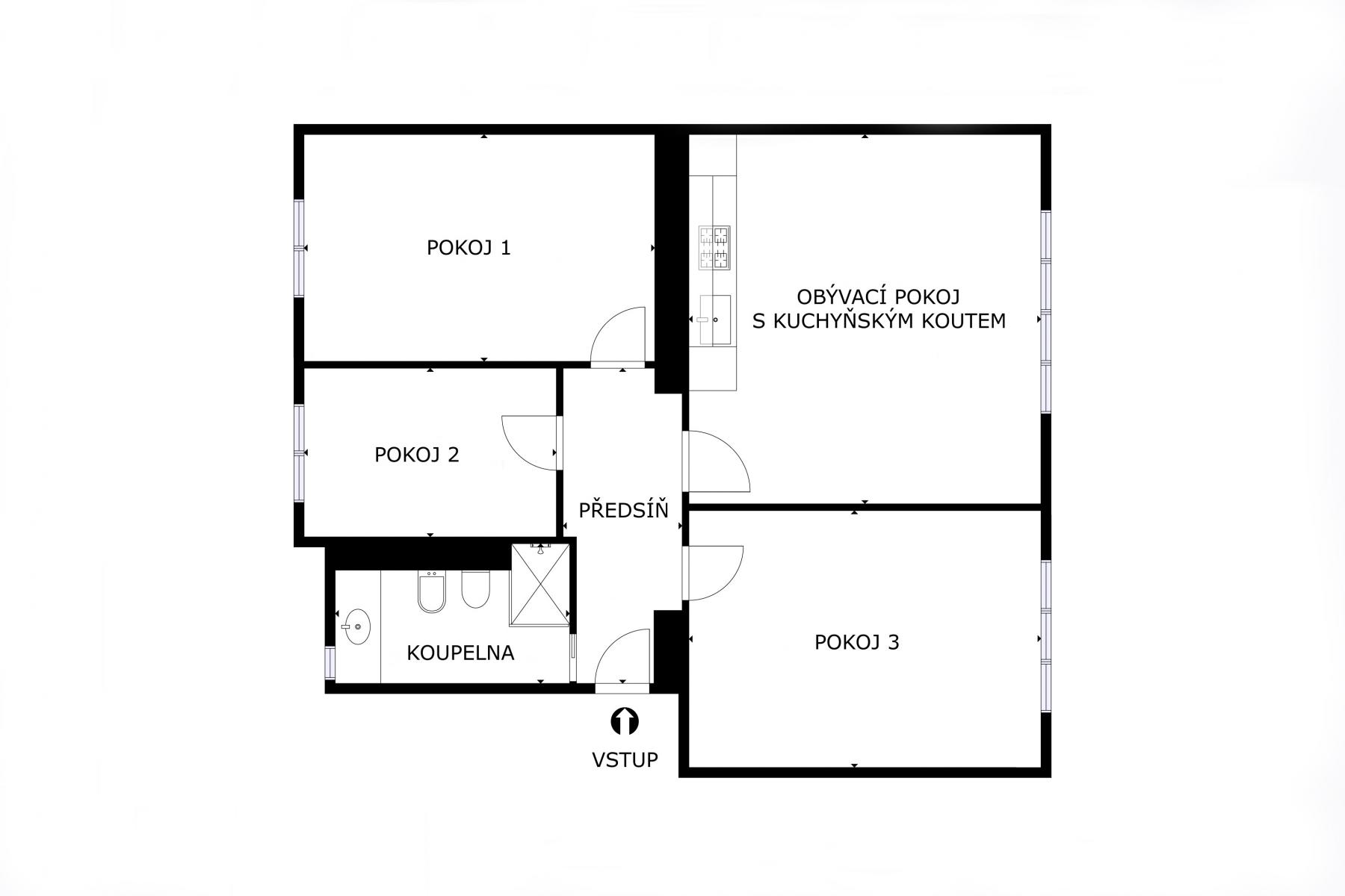 Dispozice: vzdušný obývací pokoj s kuchyňským koutem, velká ložnice, prostorný dětský pokoj, praktická pracovna, předsíň, koupelna s oknem, sprchovým koutem, WC, bidetem a podlahovým vytápěním.