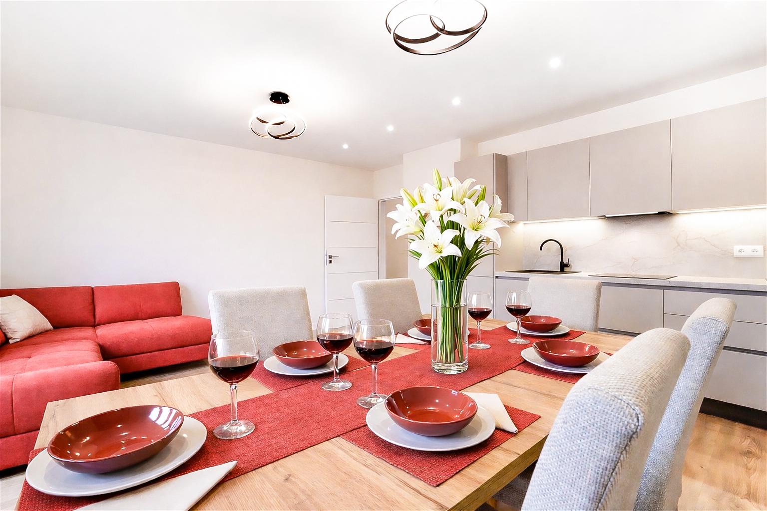Kuchyňská linka svou kvalitou i provedením odpovídá celkové úrovni bytu - nejedná se o základní řešení, ale o variantu, která počítá s tím, že je plnohodnotnou součástí hlavního obytného prostoru. Současné rozložení skříněk dává prostor si kuchyň ještě upravit a případně i rozšířit. Jedna z výhod tohoto modelu je matný povrch dveří odolný proti otiskům. Kuchyň je vybavena spotřebiči Whirlpool - indukční varná deska, trouba, integrovaná myčka, digestoř, lednice s mrazákem.