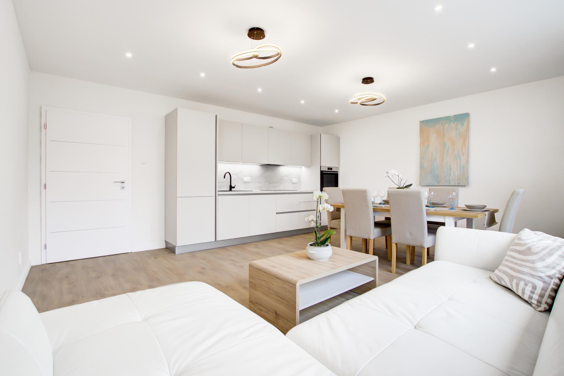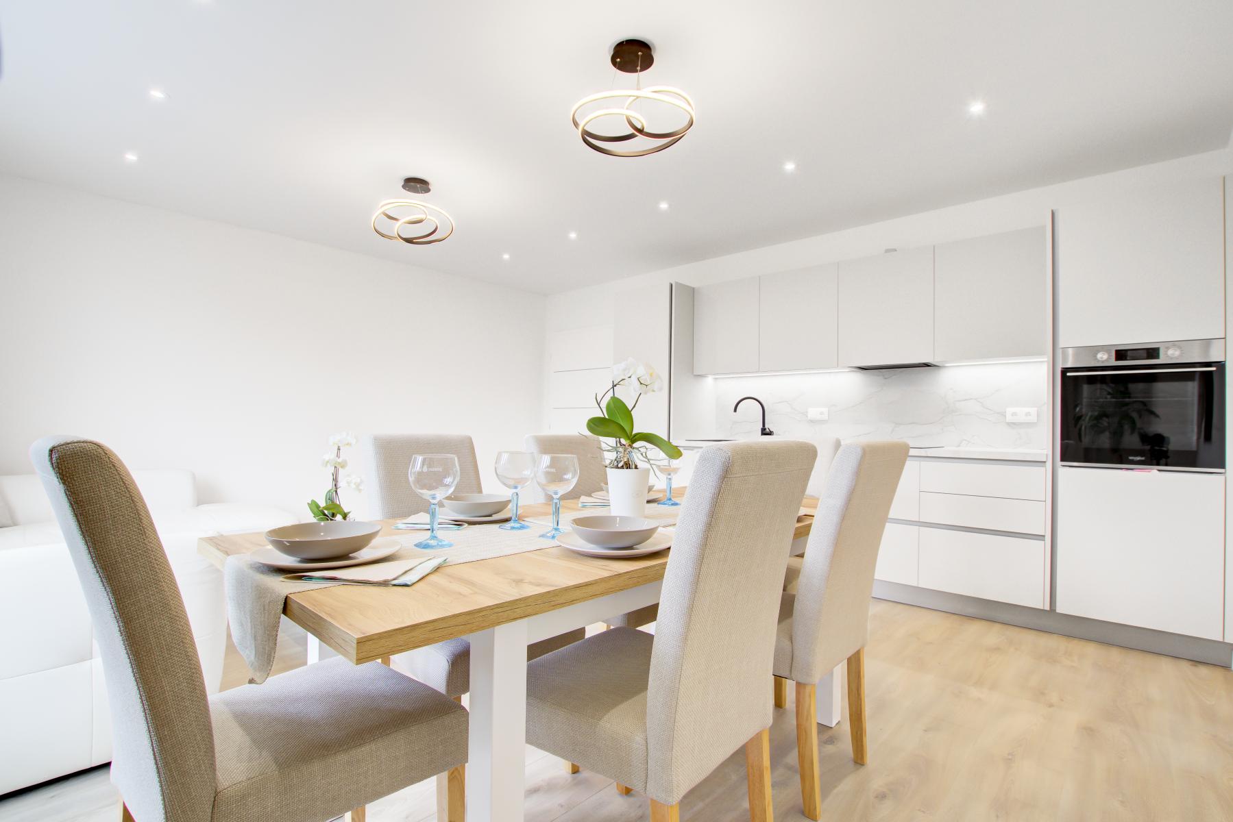 Dominantou bytu je světlý obývací prostor s velkým oknem a designovou kuchyní značky Lube, jednoho z předních italských výrobců. Kuchyňská linka v barvě bílé kávy s matným sametovým povrchem odolným proti otiskům je vybavena indukční varnou deskou, horkovzdušnou troubou, zapuštěnou digestoří, myčkou a kombinovanou lednicí s mrazákem, vše značky Whirlpool.