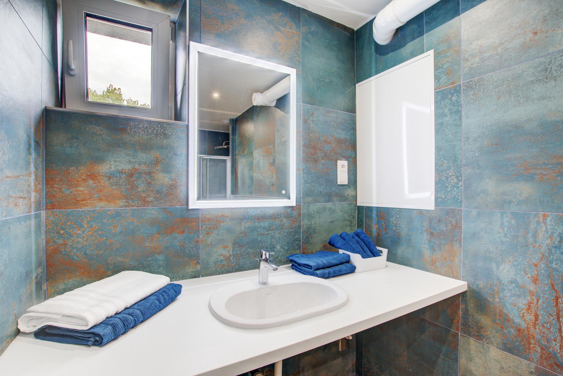 Designová koupelna je vybavena podlahovým topením, otopným žebříčkem, prostorným sprchovým koutem, umyvadlovou deskou, WC, bidetem a přípravou na pračku i sušičku. Použity byly prvotřídní materiály: sanita Villeroy and Boch, baterie Grohe, italské obklady a dlažba.