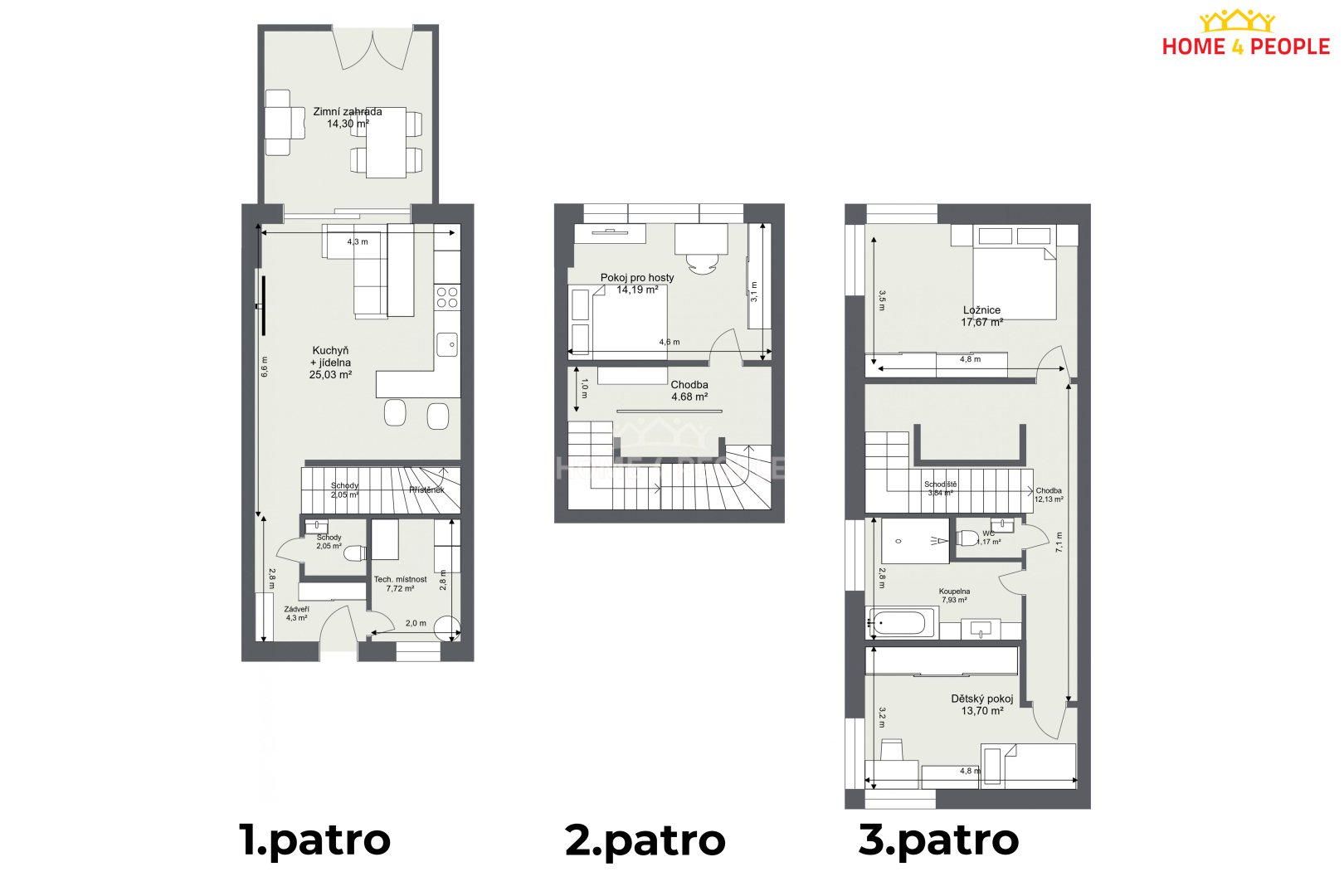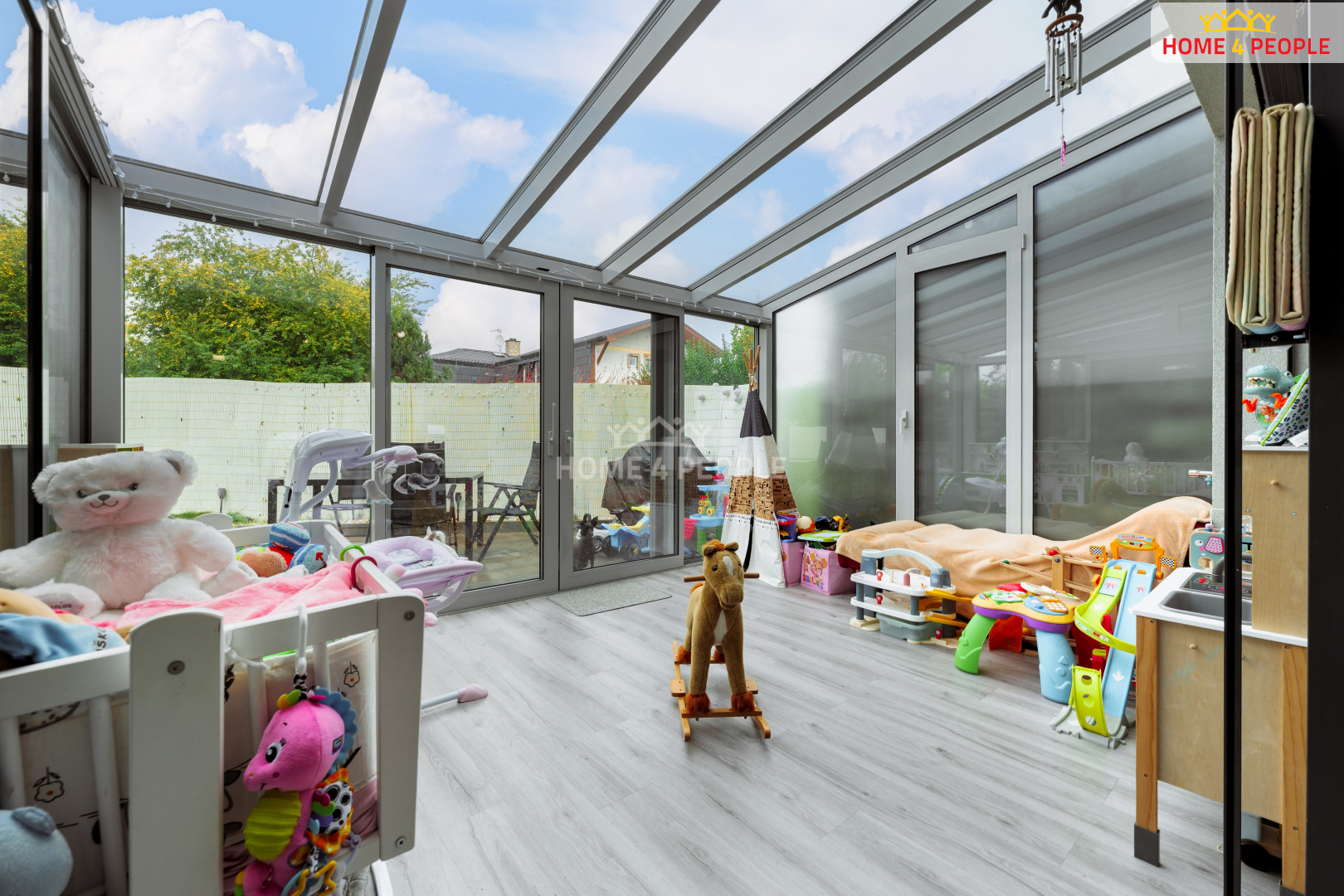 Jednotka je vytápěna úspornými uhlíkovými foliemi a zimní zahrada topnými kabely. V přízemí prostorná technická místnost, samostatné WC, velký obývací pokoj propojený se zahradou, moderní kuchyňský kout a praktický sklad pod schodištěm. Mramorové schodiště s designovým zábradlím. V 1. patře umístěna ložnice s vestavnými skříněmi pro uložení věcí a ve 2. patře jsou dva další pokoje - velká rodičovská ložnice a pokoj opět se skříněmi na míru s dostatkem úložného prostoru. Na společné chodbě samostatná toaleta a velká koupelna s vanou a sprchovým koutem. V oknech v přízemí a prvním patře venkovní žaluzie. Na podlaze je vinyl a mramor.