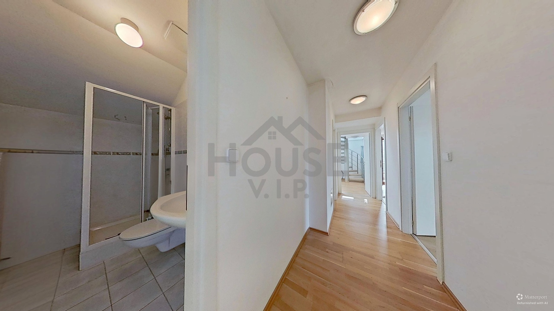 Byt je ve velmi dobrém stavu, částečně vybavený a nabízí komfortní zázemí pro moderní bydlení. Dispozice zahrnuje obývací pokoj, plně vybavenou kuchyni (lednice s mrazákem, myčka, elektrická trouba, mikrovlnná trouba, sporák, pračka), tři ložnice, pracovnu v patře, zimní zahradu, dvě koupelny se sprchovými kouty a WC, předsíň s komorou a spojovací chodbu.