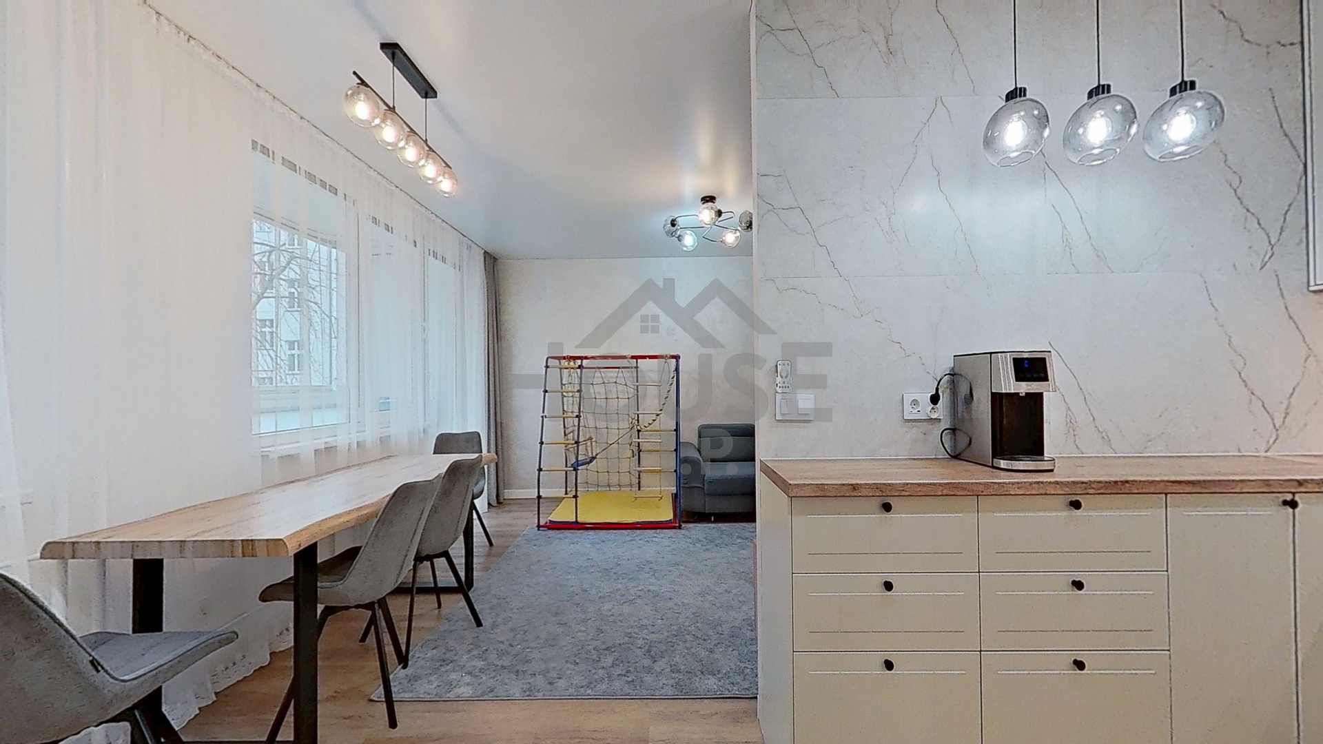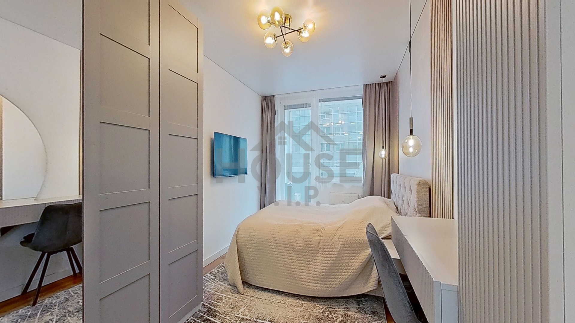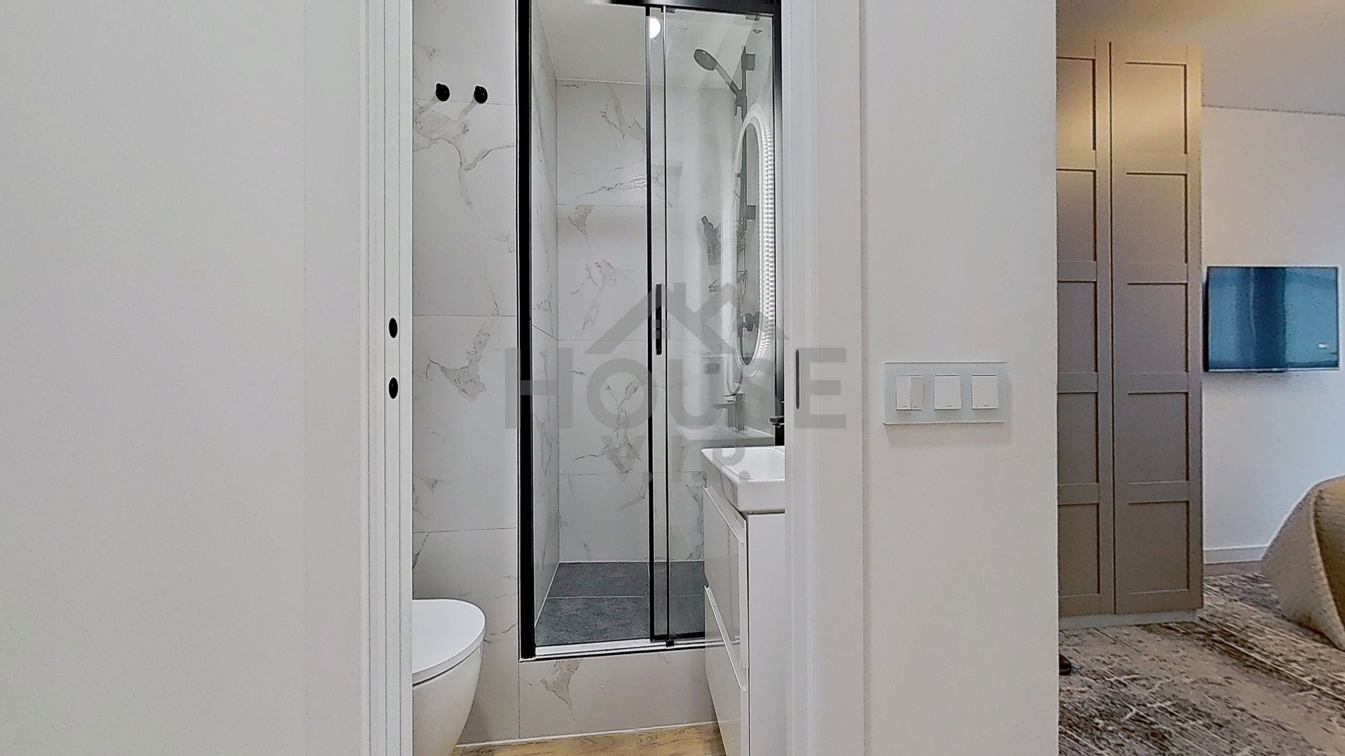 Dominantou bytu je velký obývací pokoj se vstupem na lodžii a prostorným kuchyňským koutem s plně vybavenou moderní kuchyňskou linkou ve tvaru „U“. Dále je zde ložnice s lodžií a vlastní koupelnou se sprchovým koutem a WC, další dva pokoje, koupelna s vanou, samostatné WC, prostorná chodba, nadstandardní komora a technická místnost s přípojkou na pračku. K bytu náleží sklep v přízemí domu a k dispozici je také společná místnost pro kočárky a jízdní kola. Energetický štítek G uvádíme proto, že zatím ještě nebyl dodán.
