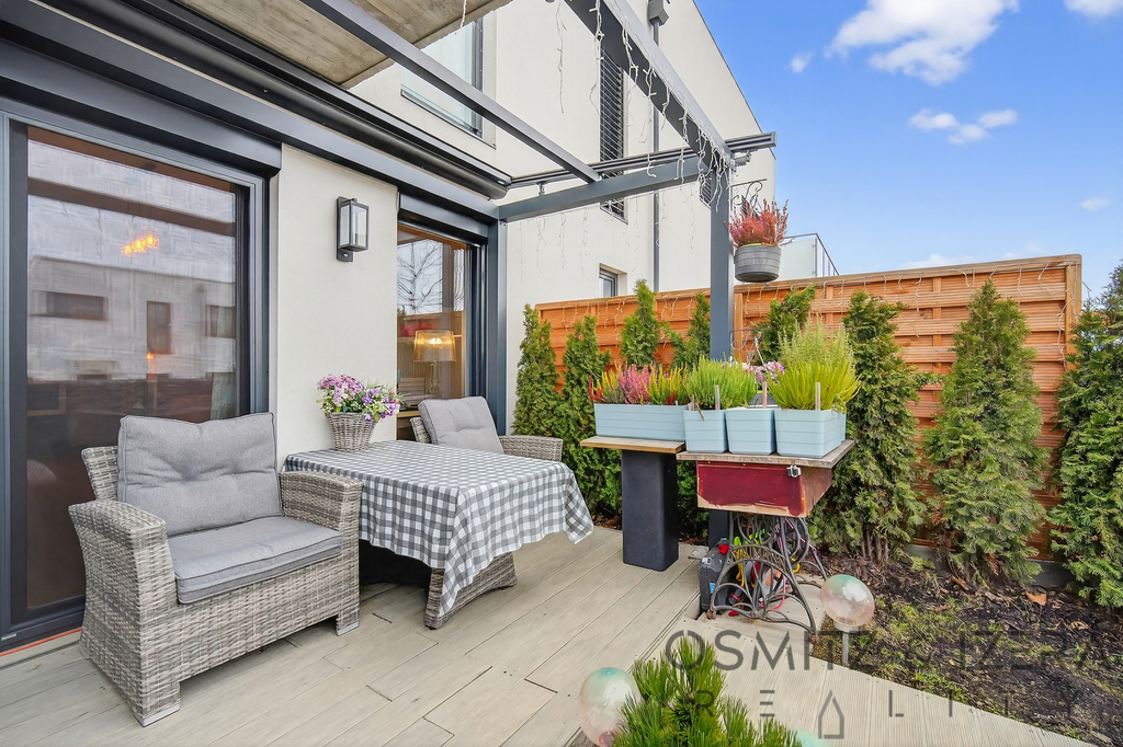 Největším lákadlem tohoto bytu je velkorysá terasa o rozloze 25 m², která díky instalované pergole s možností zastínění s dálkovým ovládáním slouží jako letní obývák. Ať už plánujete grilování s přáteli, ranní jógu nebo relaxaci s knihou, zde najdete dokonalé soukromí. Byt v přízemí je dobře přístupný a v podstatě bezbariérový.