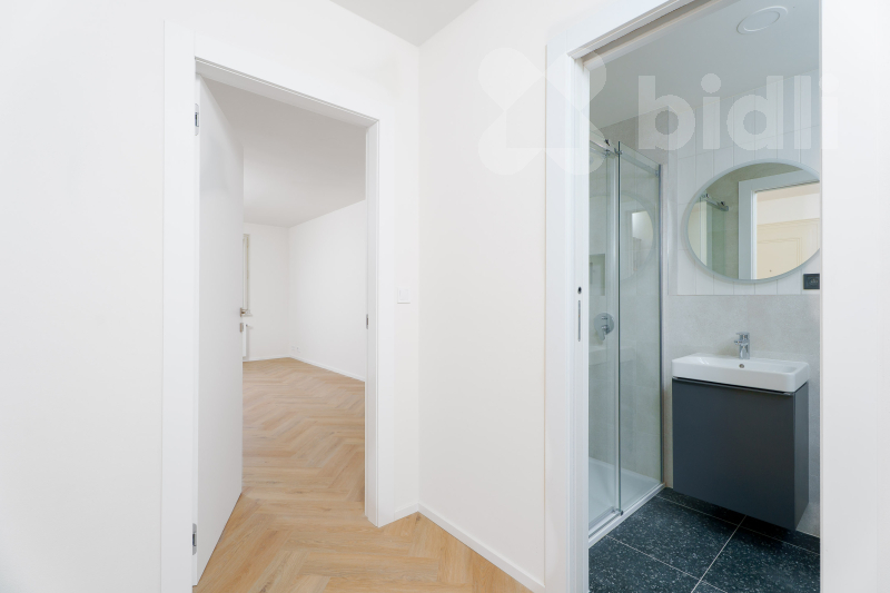 Přednosti bytu: Unikátem tohoto bytu je jeho orientace - okna směřují na východ i západ, přičemž na obou stranách se nachází park. Díky tomu je byt nejen světlý, ale nabízí i klid a krásné výhledy (včetně pohledu na kostel). Dispozice zahrnuje vstupní chodbu, obývací pokoj s přípravou na kuchyňský kout, ložnici s balkonem a moderní koupelnu se sprchou a toaletou.