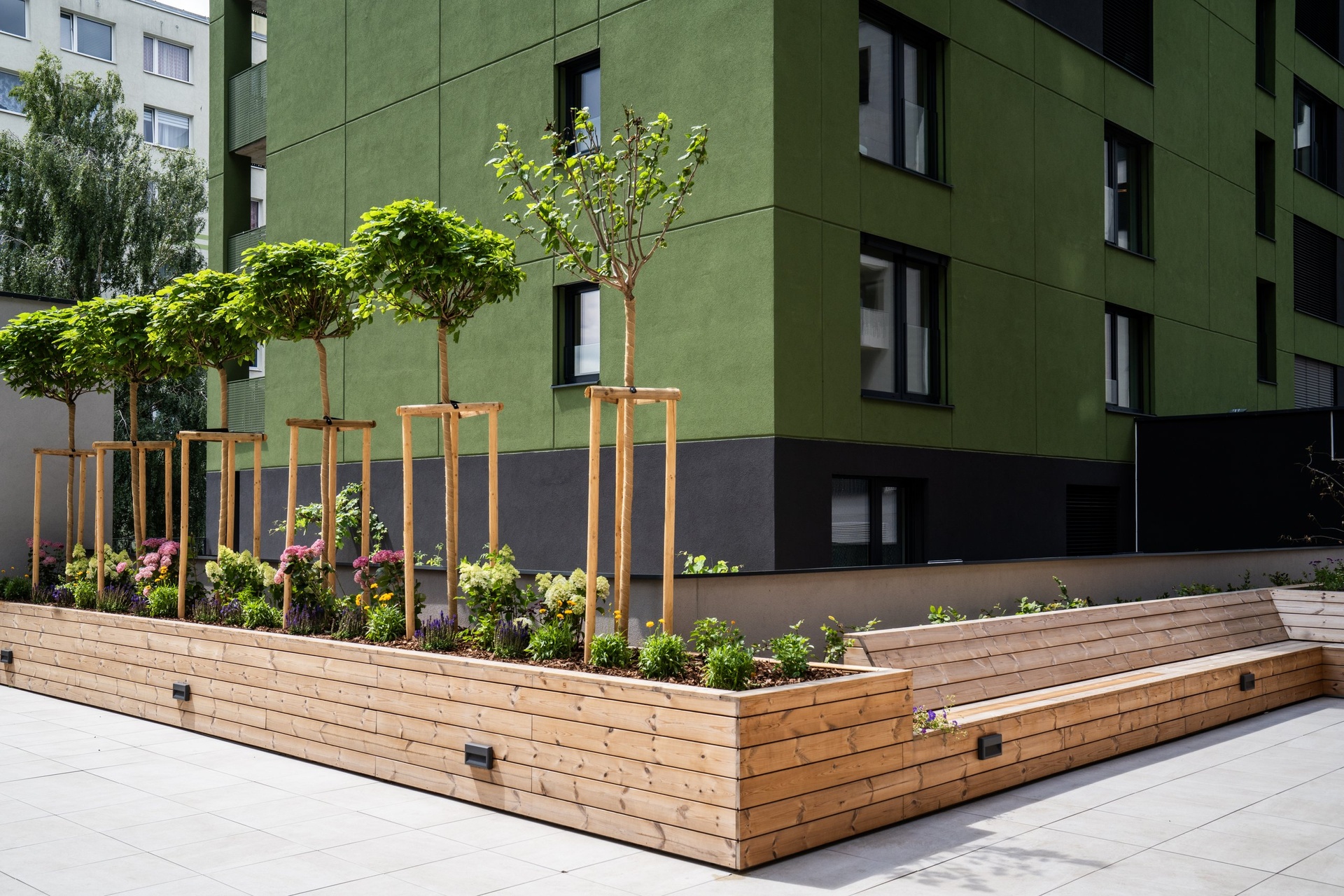 Východně orientovaný balkon je přístupný z obou obytných místností, zatímco jižně orientovaný balkon je přístupný z obývacího pokoje. Nabízejí výjimečný venkovní prostor pro relaxační část, odpočinek, posezení i městské zahradničení.