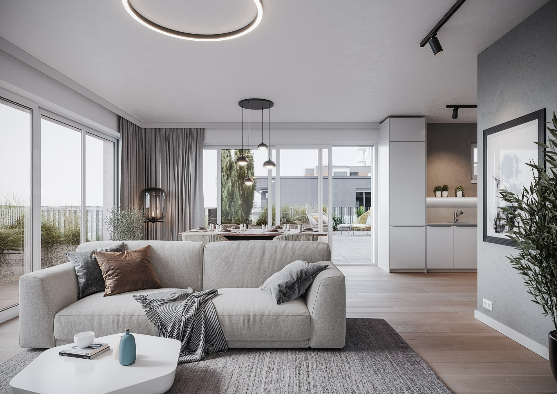 Na východ i západ orientovaný prostorný a vzdušný byt 3+kk o celkové rozloze téměř 77 m2 s útulným balkonem o velikosti 5 m2.