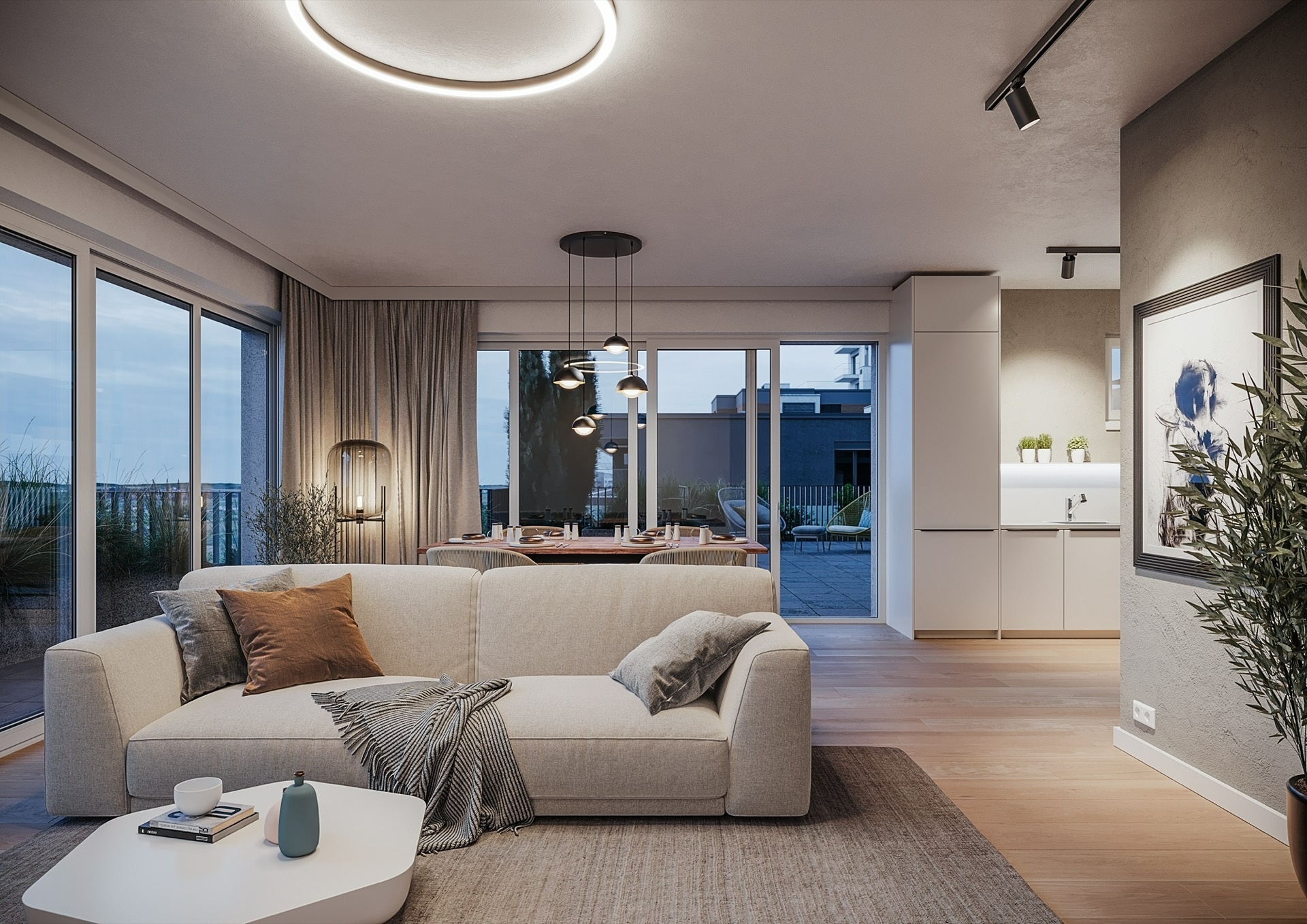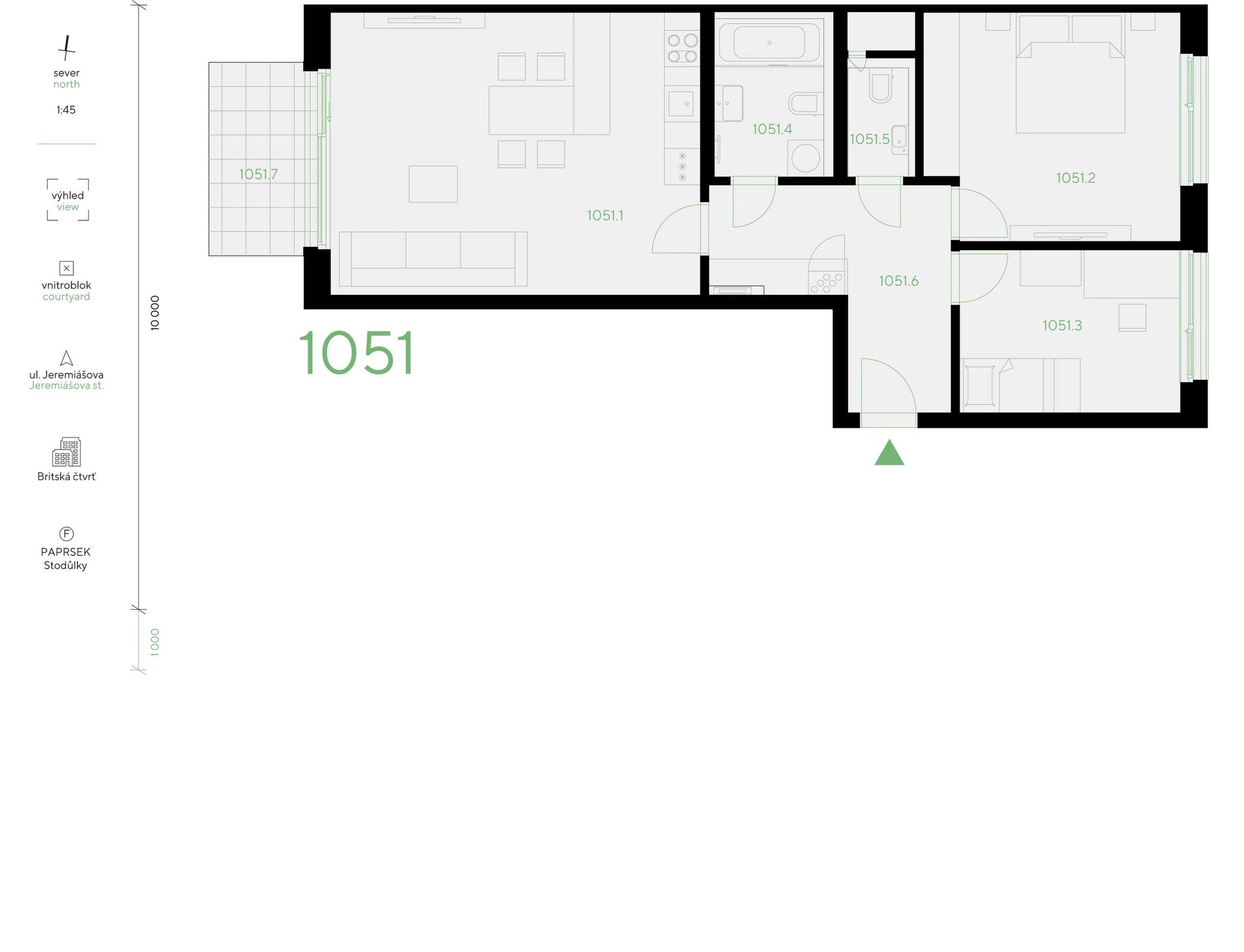 Na východ orientovaný prostorný a vzdušný byt 3+kk o celkové rozloze 77 m2 s útulným balkonem o velikosti 5 m2.