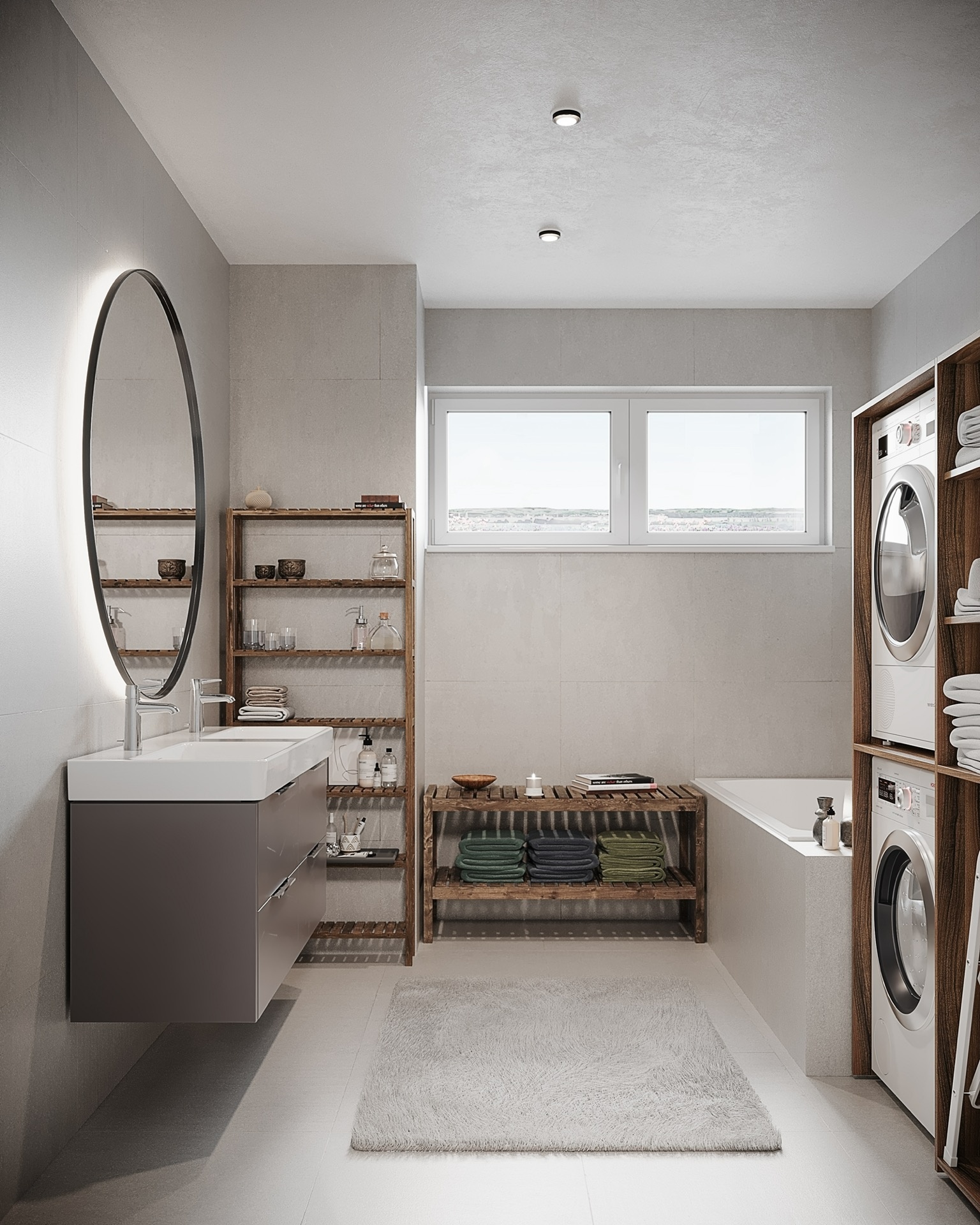 Koupelna je vybavena vanou, toaletou a umyvadlem a nachází se v ní připojení pračky, samostatné wc s umývátkem je umístěno hned vedle. Byt je ideální volbou pro rodiny nebo náročné páry, které potřebují pracovnu pro home office.