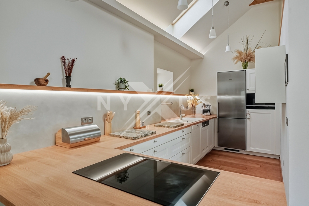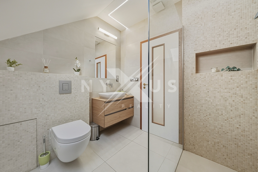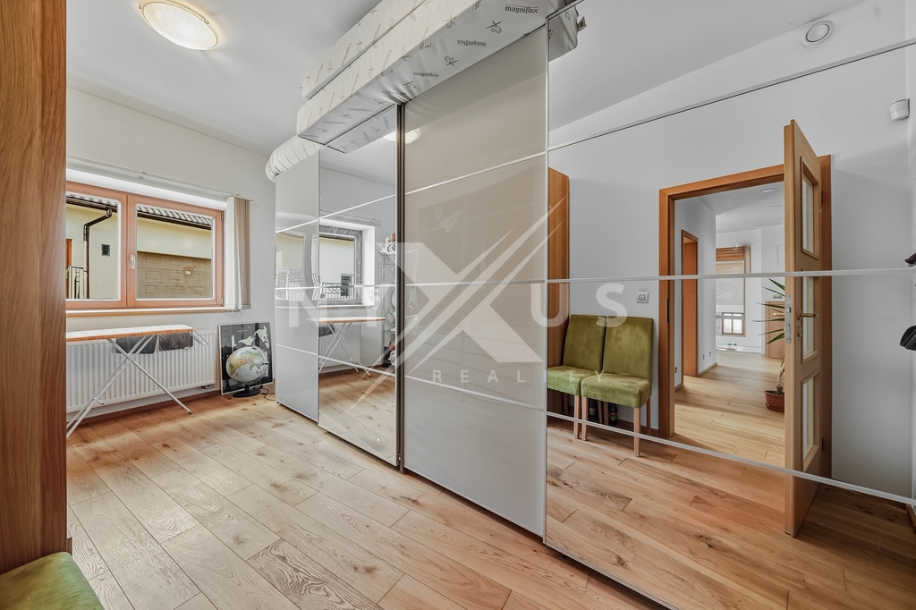 Horní patro funguje téměř jako samostatná jednotka, nicméně se vchodem skrze hlavní část. Aktuálně je řešeno jako prostorné 1+kk s vlastní kuchyní, koupelnou a terasou s výhledem do zahrady, přičemž prostor lze snadno rozdělit na 2+kk. Výhodou je také, že terasa má přívod vody, připravenou elektřinu pro pergolu a nosnost pro vířivku.