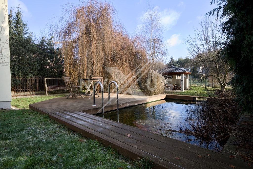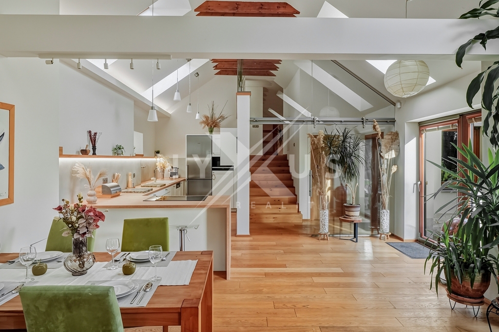 Dům je zasazený do klidného prostředí se zelení, s mírou soukromí, která v rámci Prahy není samozřejmostí.