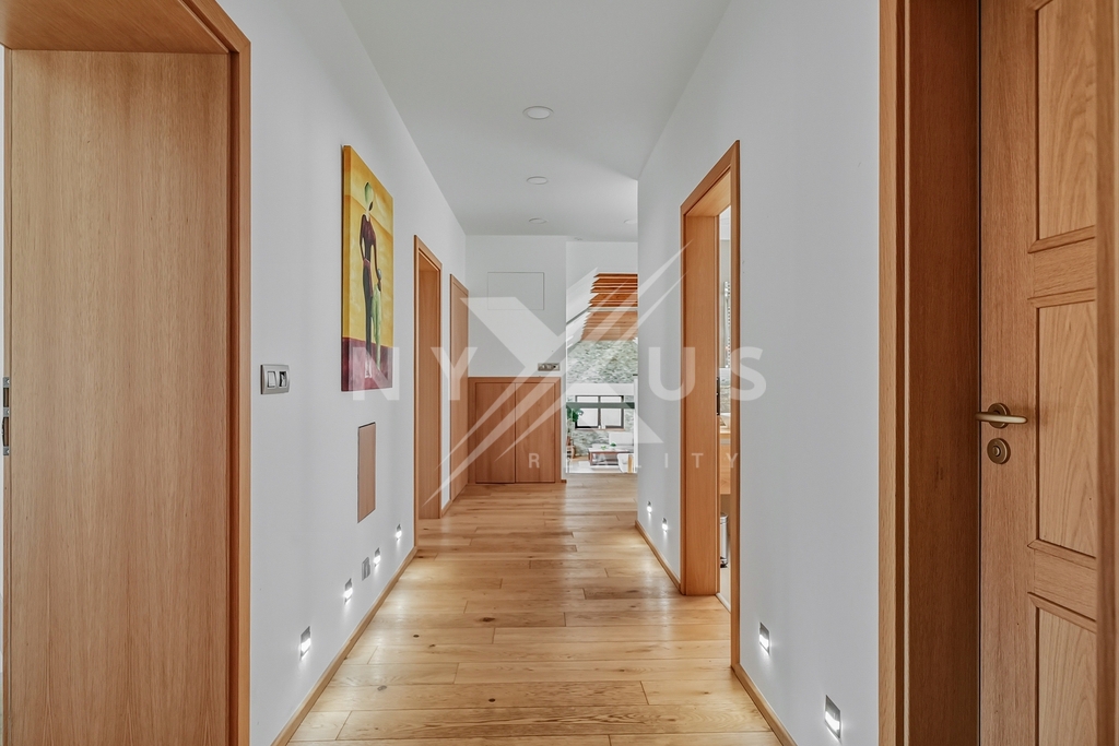 Interiér je postaven na kvalitních materiálech – třívrstvé dubové podlahy s anhydritovým podkladem a teplovodním podlahovým topením, v menších místnostech doplněné o radiátory. Osvětlení je řešeno LED rampami na míru s důrazem na přirozený světelný komfort s možností tlumení a změny barev.