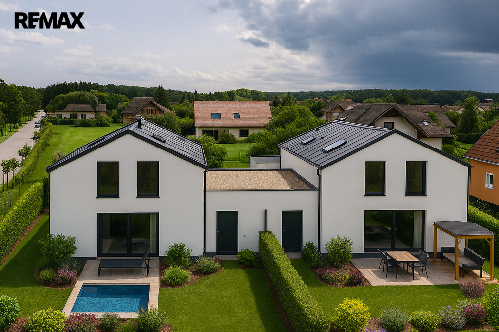 • dvojdům propojený pouze garážemi – soukromí v obytných částech i na zahradách
