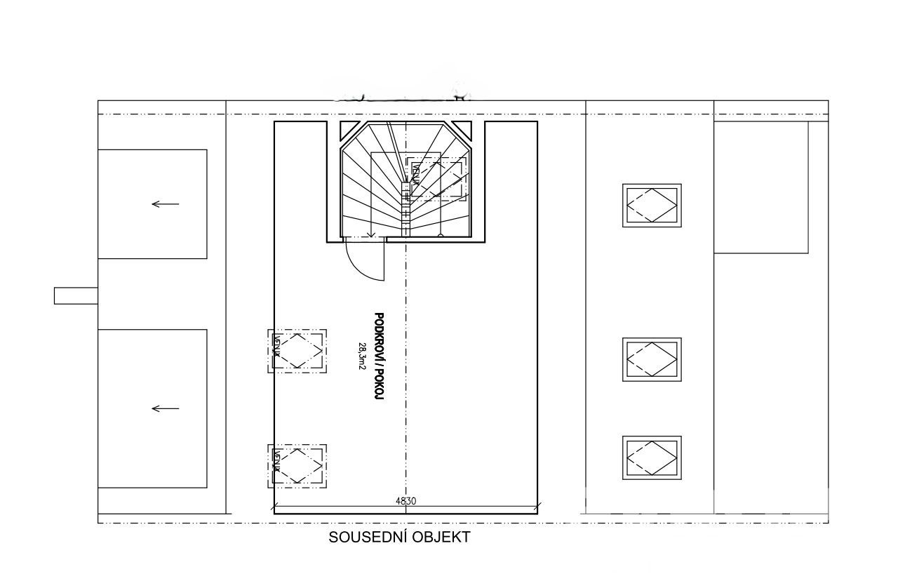 Jedná se o čtyř podlažní rodinný dům, kolaudovaný v roce 1992. V přízemí domu se nachází prostorná vstupní hala, v zadní části je sklep a technické zázemí, koupelna s prádelnou a plynovým kotlem, dále samostatný pokoj, plocha 25,3m2 (hostinská místnost s vlastním vstupem, sprchou, toaletou a vlastní terasou), tato jednotka může sloužit i k nezávislému pronájmu.