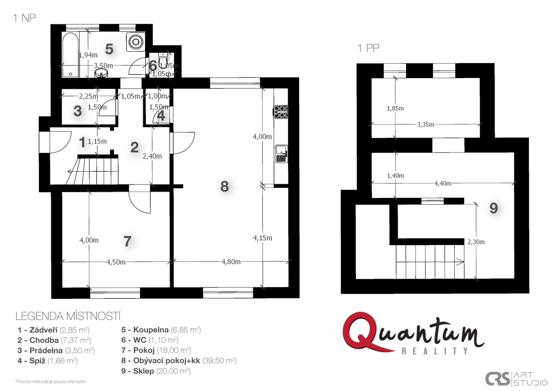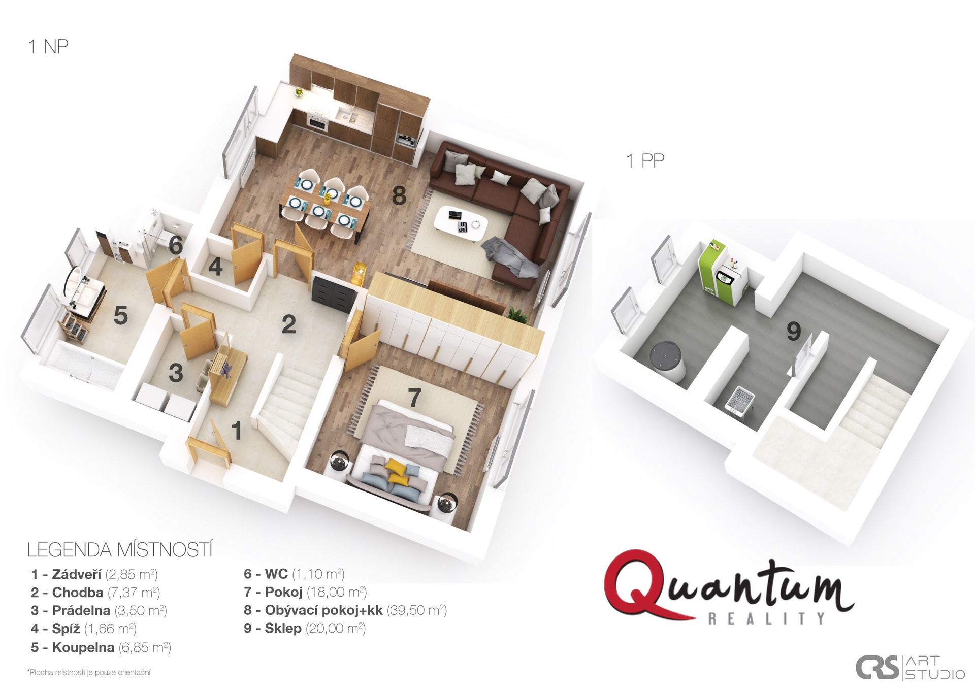• přízemí: obývací pokoj se schodištěm, kuchyňský kout, koupelna se sprchou a WC