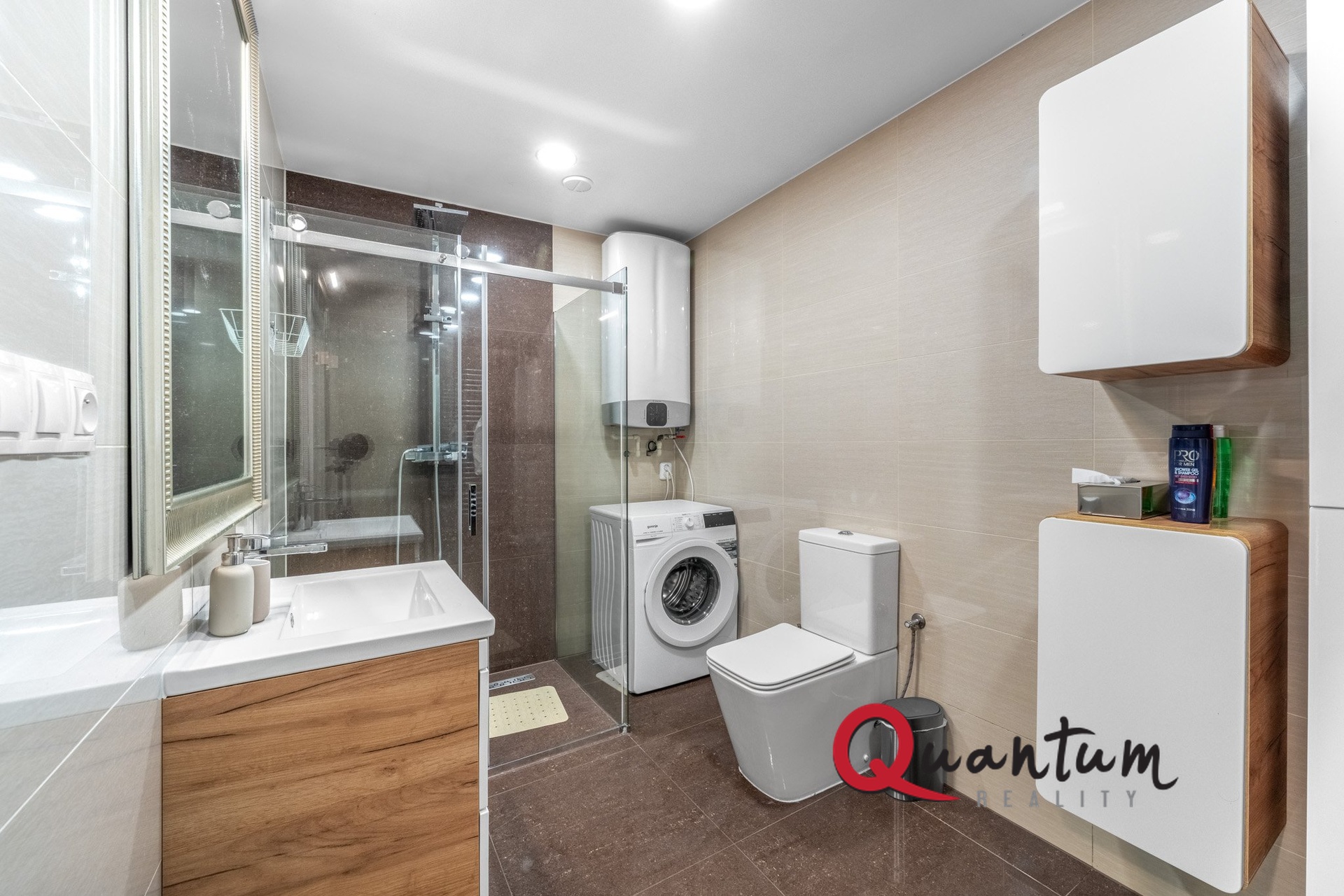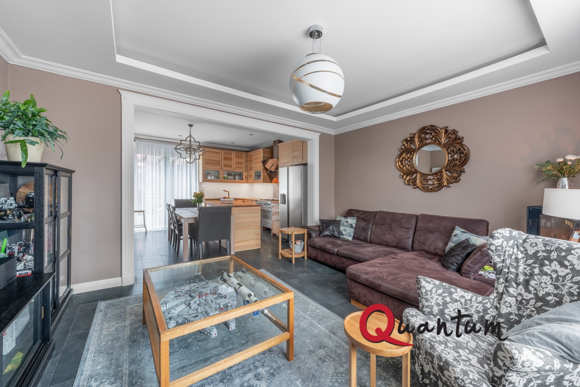 V přízemí se nachází prostorný obývací pokoj s nadstandardně vybaveným kuchyňským koutem a jídelnou, propojený s venkovní terasou ze sibiřského modřínu. Na terase je vkusné posezení a vířivka. Dále je zde pokoj, koupelna se samostatnou toaletou, technická místnost a spíž. Podlahy tvoří luxusní velkoformátová dlažba, pouze v pokoji je dřevěná plovoucí podlaha.