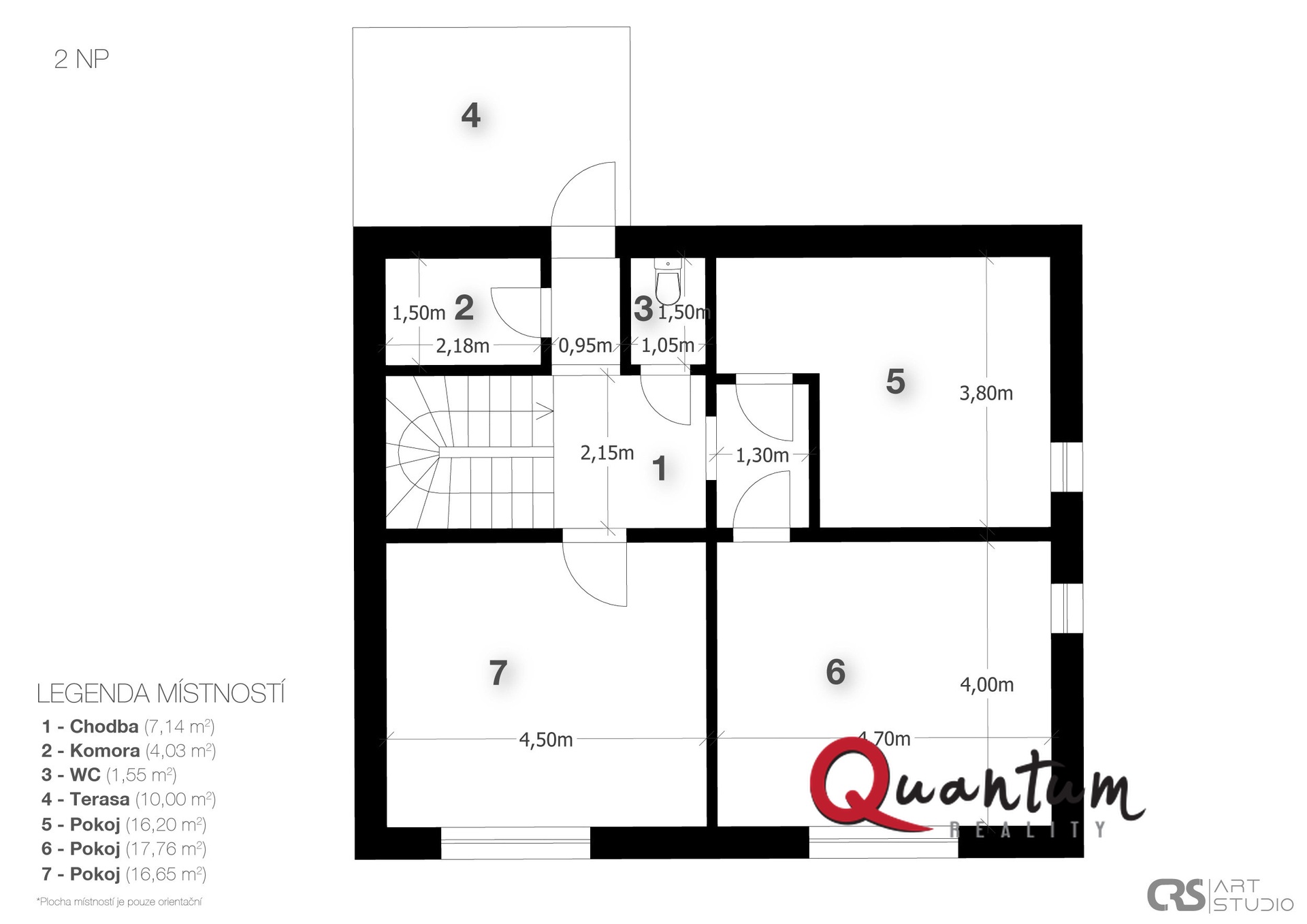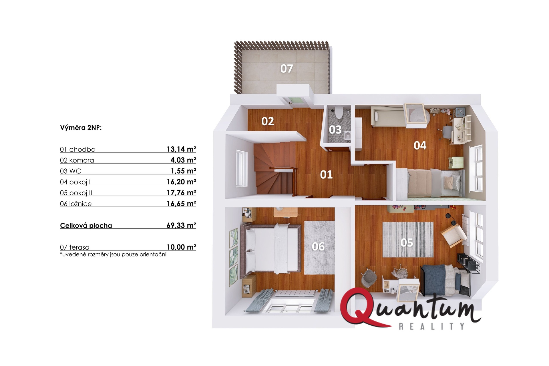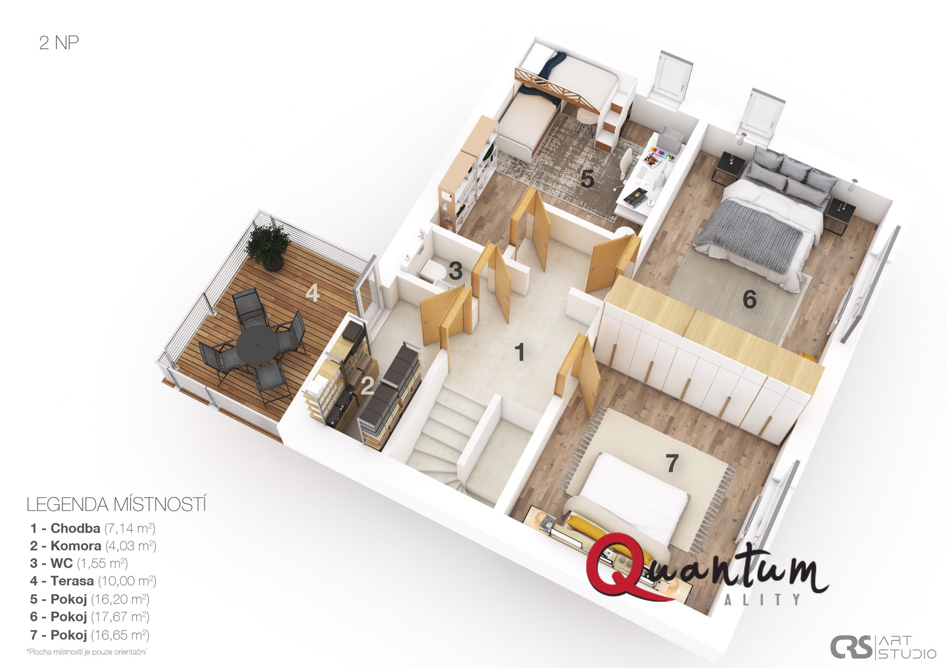 Dřevěné schodiště vede do 2. podlaží, kde jsou dva světlé dětské pokoje, ložnice, toaleta, komora a chodba s přístupem na druhou terasu s výhledem do zahrady. Nad tímto podlažím se nachází kvalitně zpracovaná půda vhodná k uskladnění věcí (není započítána do celkové plochy).