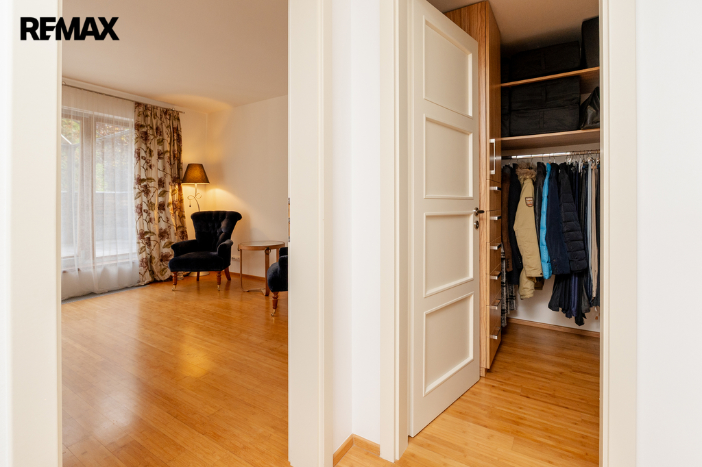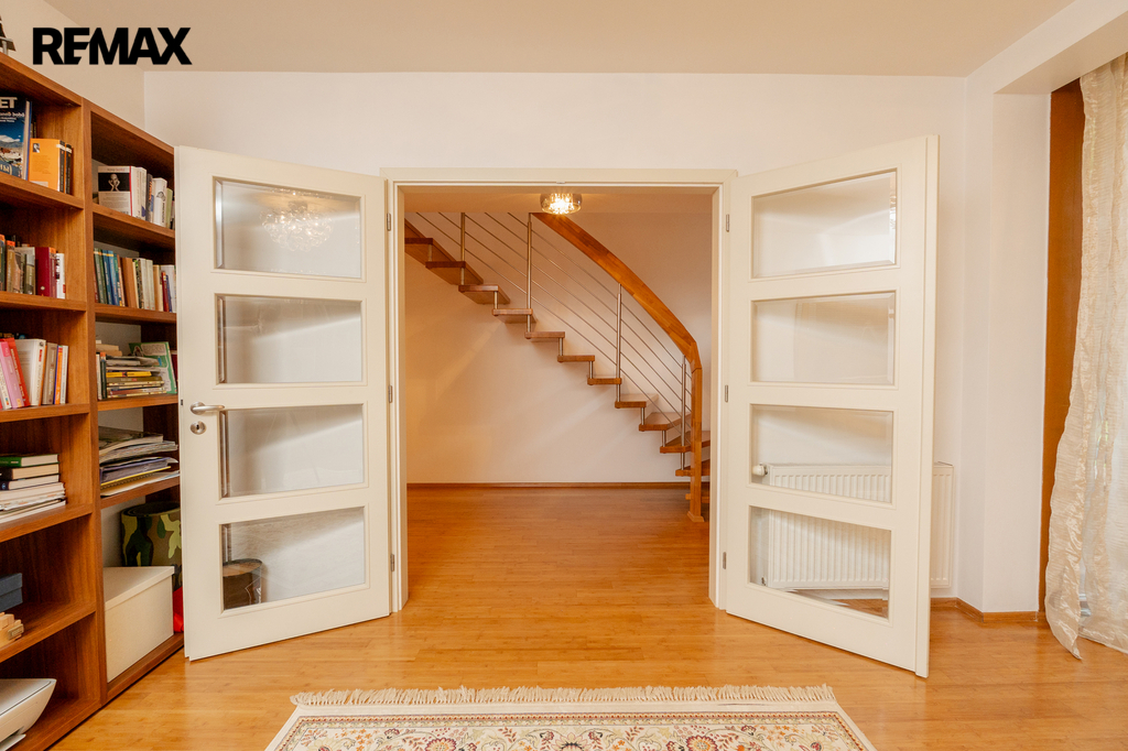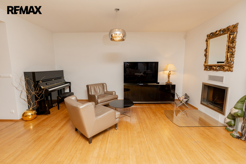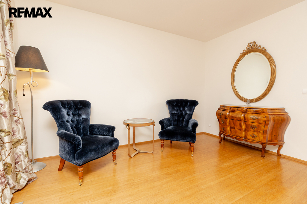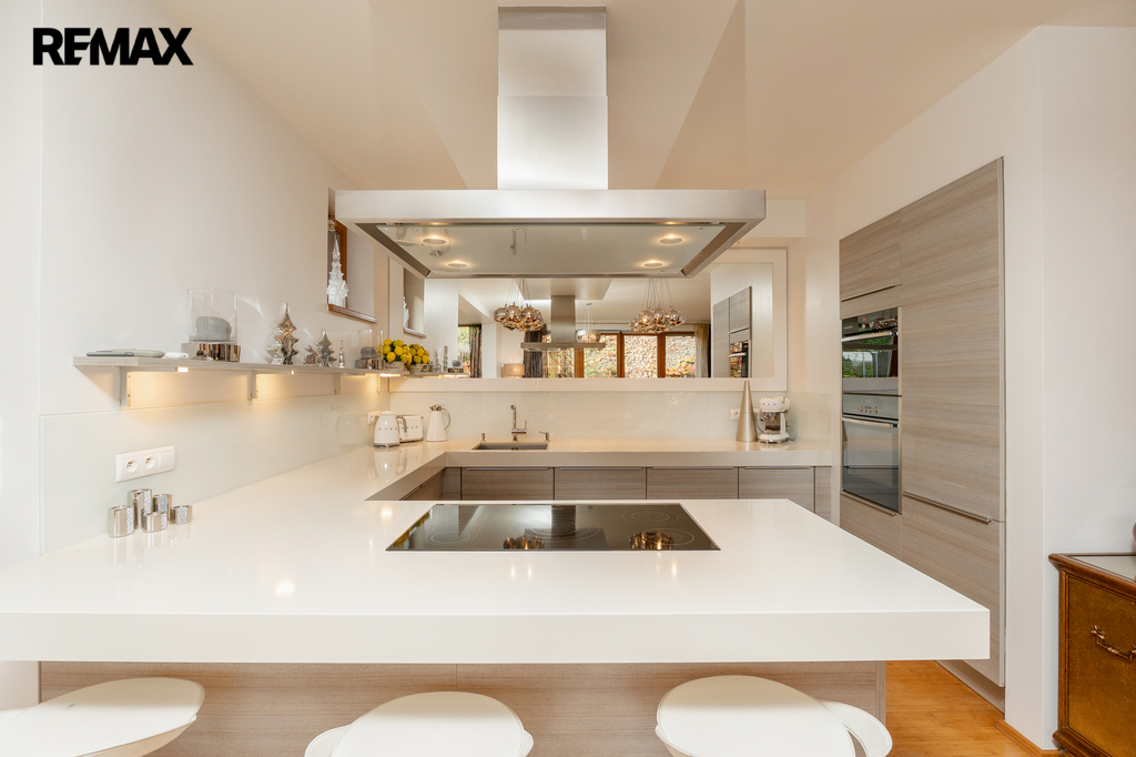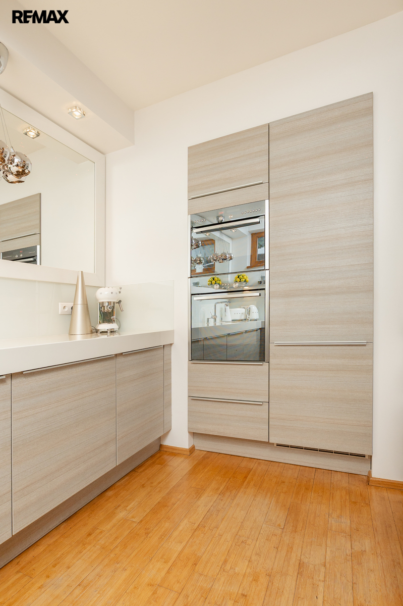 Součástí obytné části je designová kuchyň značky Poggenpohl, vybavená veškerými vestavěnými spotřebiči. Velká francouzská okna zajišťují dostatek denního světla a dodávají interiéru vzdušnost a eleganci.