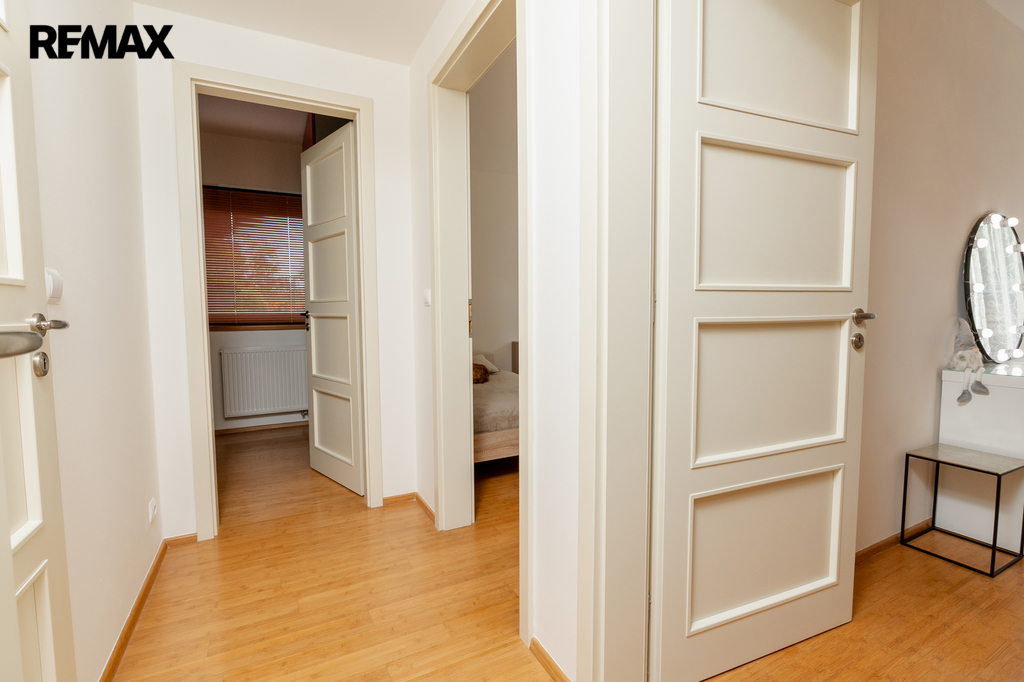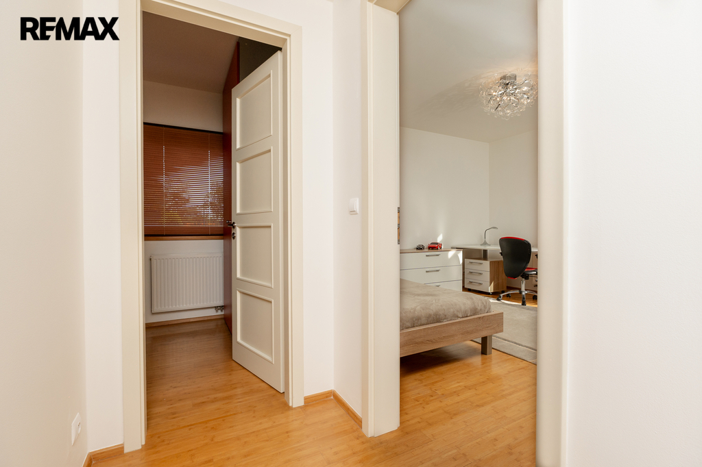 Horní patro je rozděleno na dětskou a rodičovskou část. Každá z nich je oddělena chodbou a má vlastní koupelnu, šatnu i terasu, což zajišťuje maximální soukromí pro všechny členy rodiny. Hned u vstupu do domu se nachází praktická šatna.