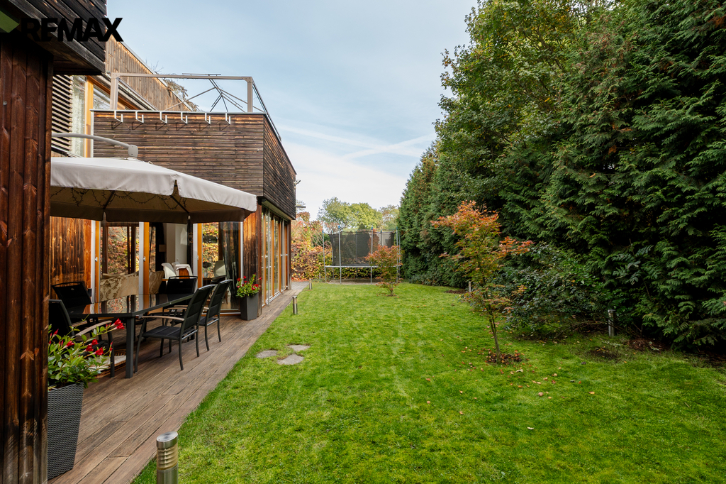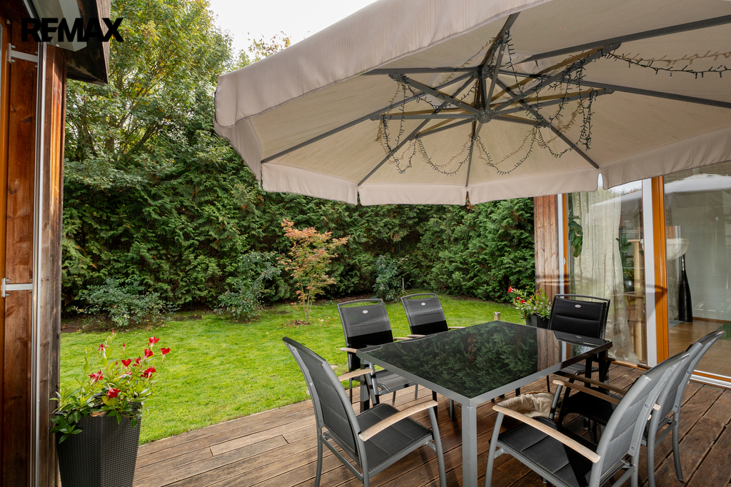 Z obou místností je přímý vstup na zahradu, kde rostou vzrostlé túje o výšce přibližně 7 metrů, které zajišťují maximální soukromí.