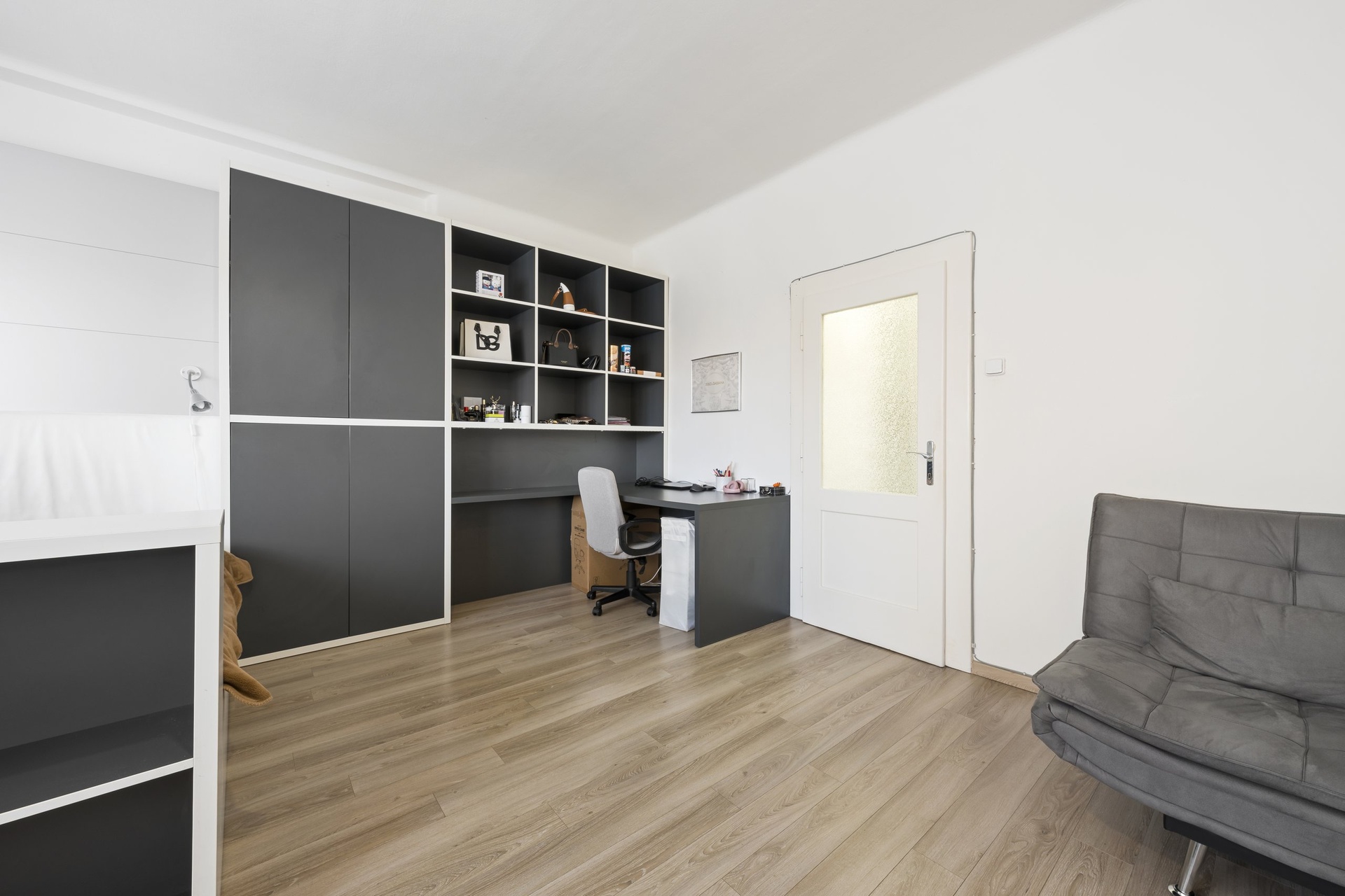 Obývací pokoj je vybaven vestavným nábytkem na míru, který zahrnuje komfortní dvoulůžko s úložnými prostory, prostorné vestavné skříně a psací stůl vhodný pro práci i studium. Díky tomuto řešení působí interiér velmi čistě, vzdušně a funkčně.