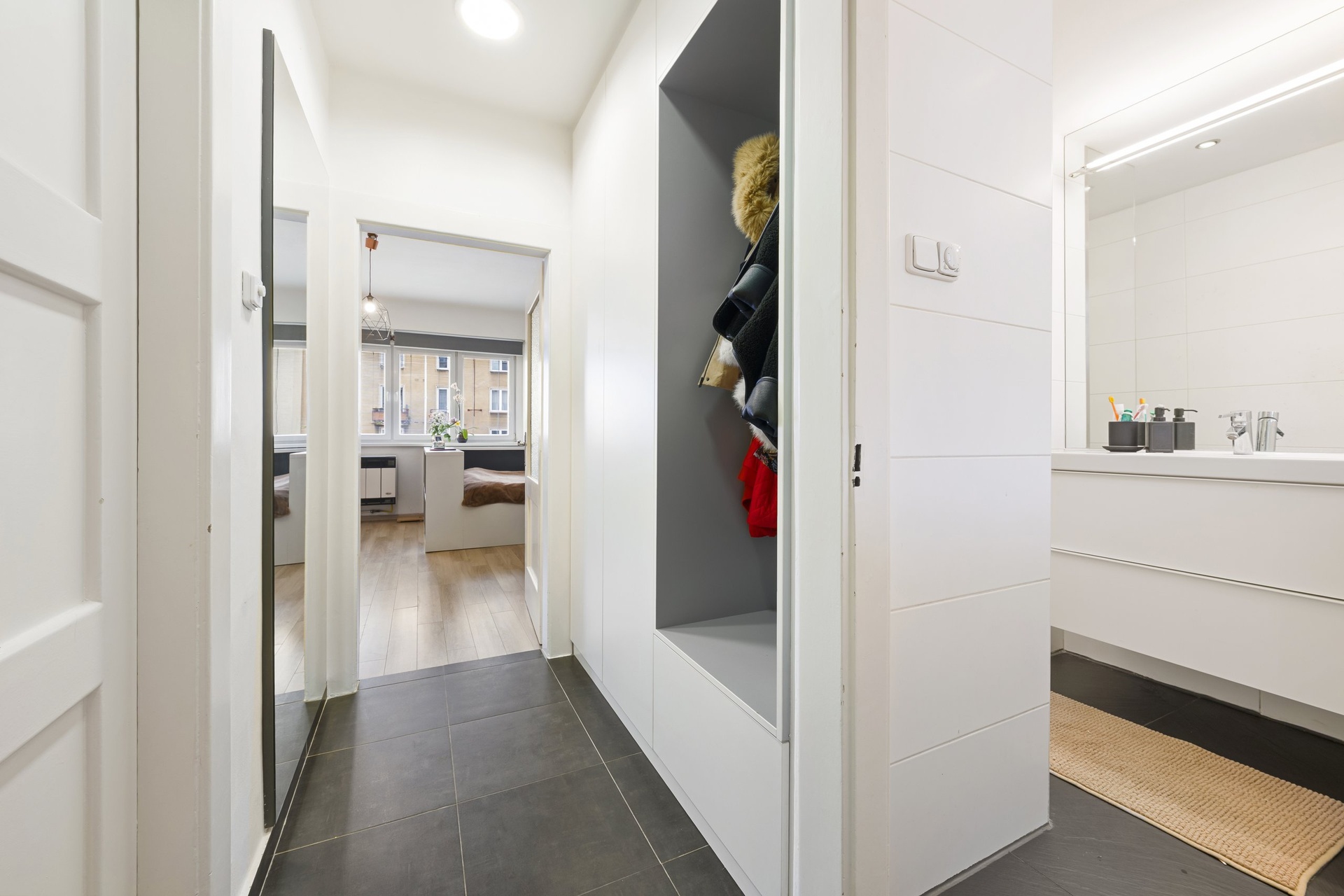 Dispozice bytu je prakticky řešena s důrazem na maximální využití prostoru. Nabízí vstupní předsíň s úložným prostorem, koupelnu se sprchovým koutem, WC a místem pro pračku, samostatnou kuchyni s dostatkem prostoru pro vaření a světlý obytný pokoj.