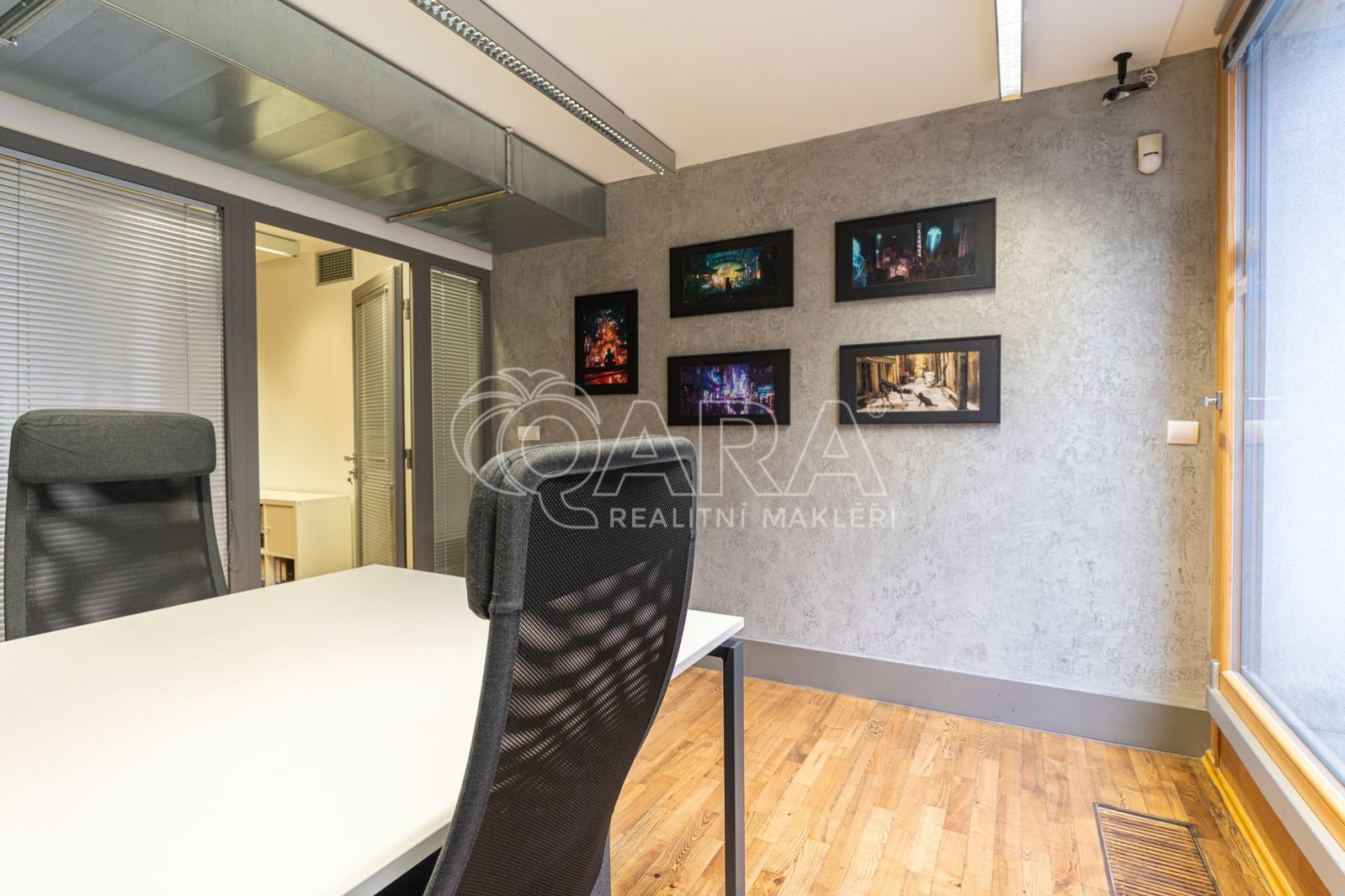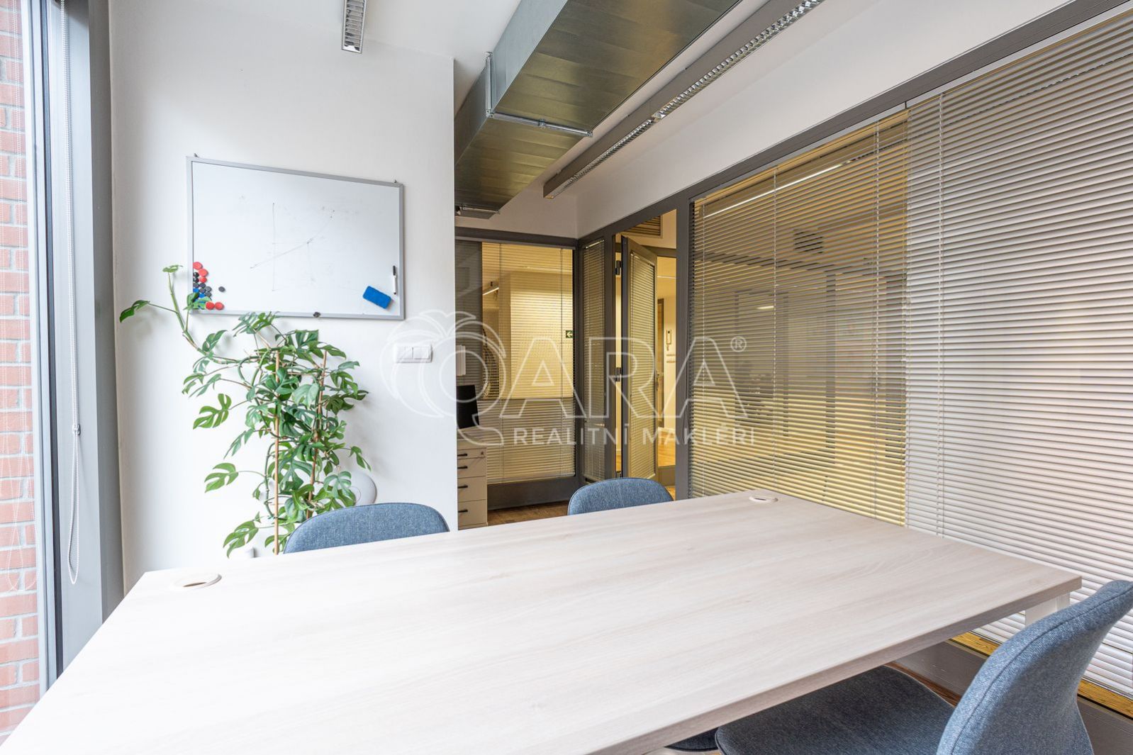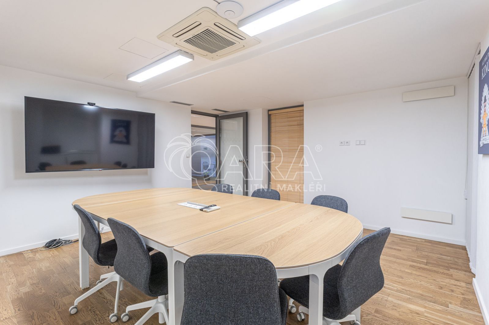 Prostor o celkové rozloze kanceláří 335 m je klimatizovaný. Dispozice nabízí dvě větší otevřené místnosti, dvě místnosti oddělené skleněnou stěnou, přičemž jedna z nich má vstup na terasu o velikosti 17 m, samostatnou uzavřenou místnost, zasedací místnost a prostor pro recepci či posezení návštěv. Zázemí zahrnuje kuchyňku, jídelní kout, 2x moderní sociální zařízení se sprchou, serverovnu a úklidovou místnost.