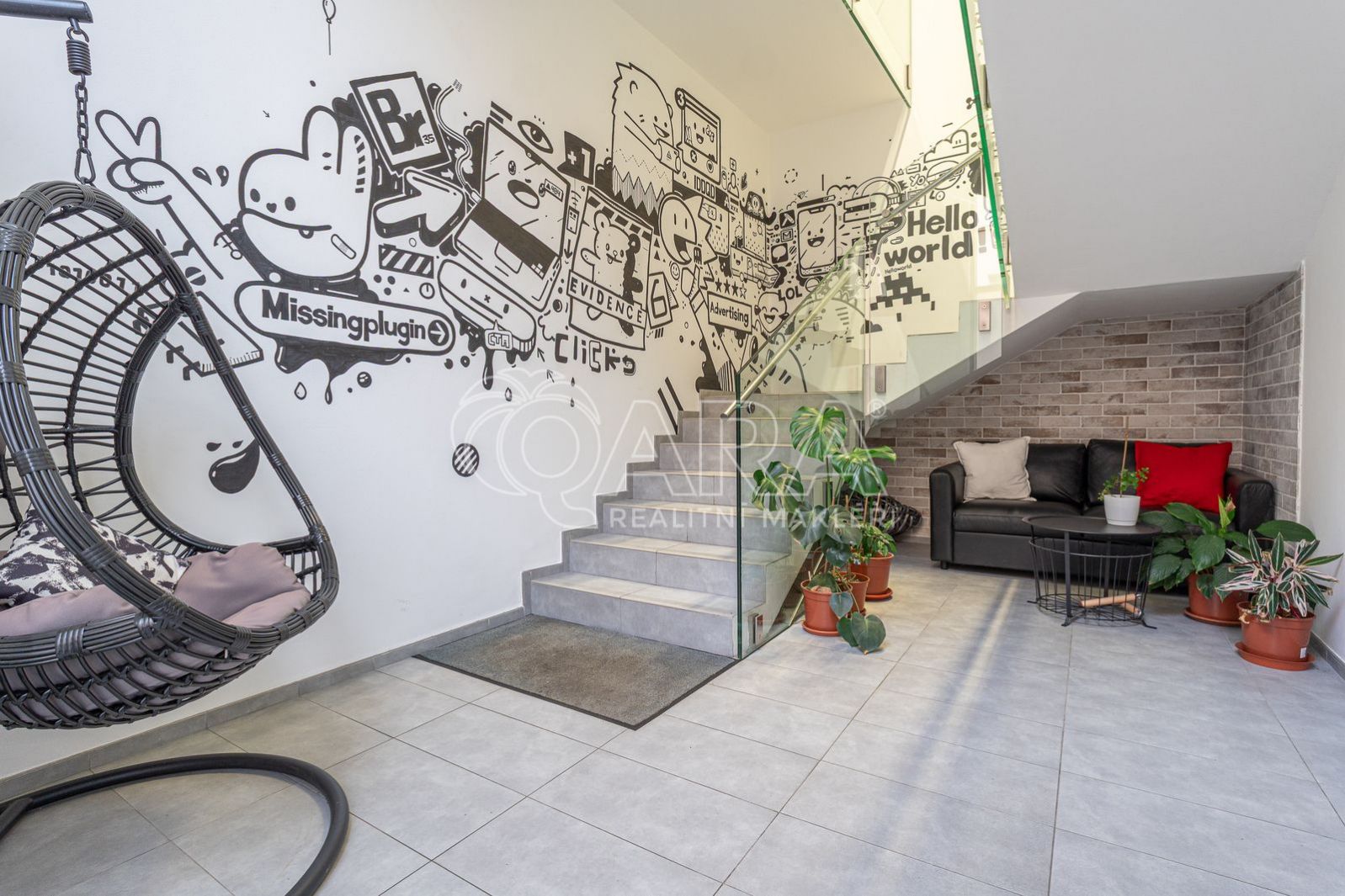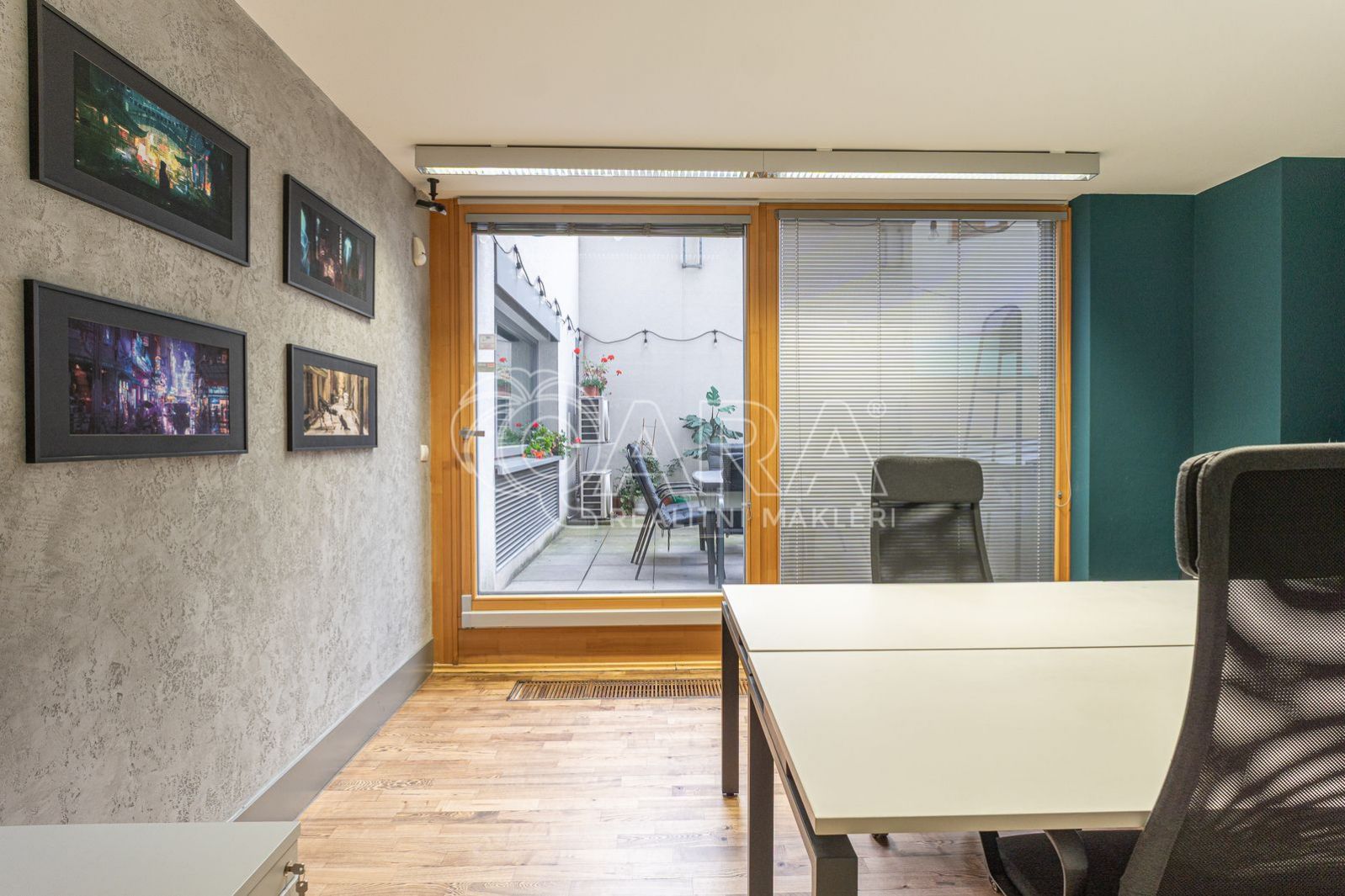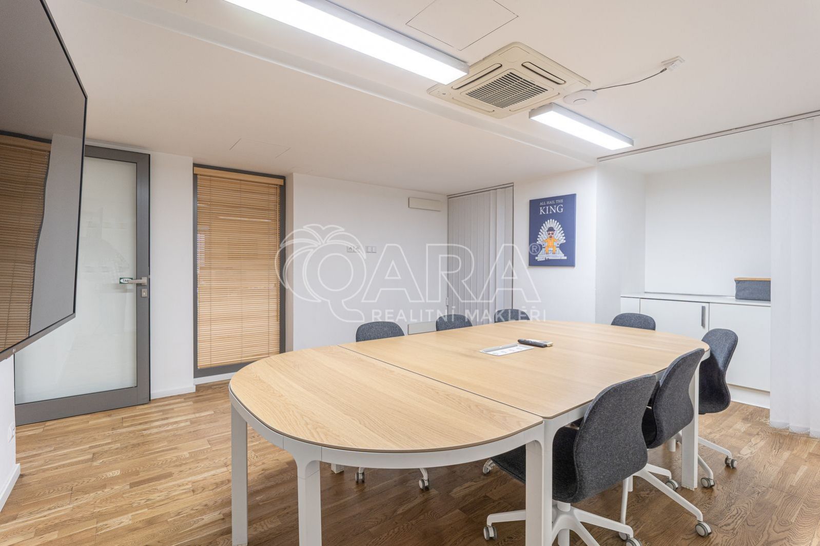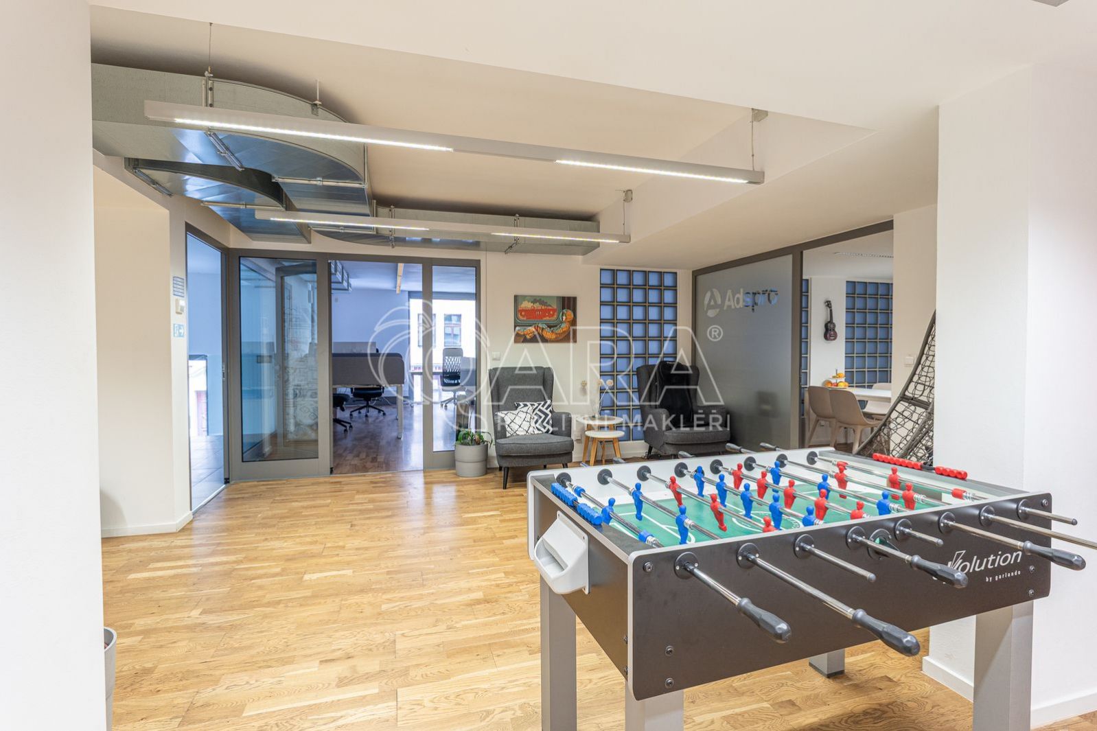 Prostor o celkové rozloze kanceláří 335 m je klimatizovaný. Dispozice nabízí dvě větší otevřené místnosti, dvě místnosti oddělené skleněnou stěnou, přičemž jedna z nich má vstup na terasu o velikosti 17 m, samostatnou uzavřenou místnost, zasedací místnost a prostor pro recepci či posezení návštěv. Zázemí zahrnuje kuchyňku, jídelní kout, 2x moderní sociální zařízení se sprchou, serverovnu a úklidovou místnost.