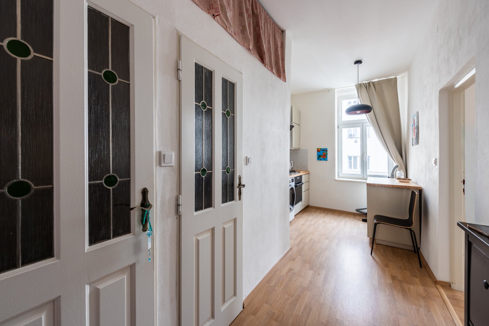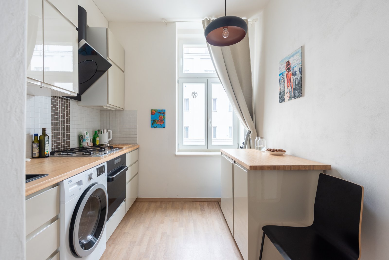 Dispozice bytu je ideální pro jednotlivce nebo pár, který si potrpí na pozitivní prostor a světlo. Obě místnosti jsou orientovány směrem do ulice. Obývací pokoj (o velikosti 24,5m2) plynule navazuje na kuchyň, útulná koupelna je vybavena sprchovým koutem, toaleta je vedena samostatně. Kuchyňská linka je plně vybavena – plynový sporák, elektrická trouba, digestoř, lednice – připravena na nedělní obědy i večerní improvizace.