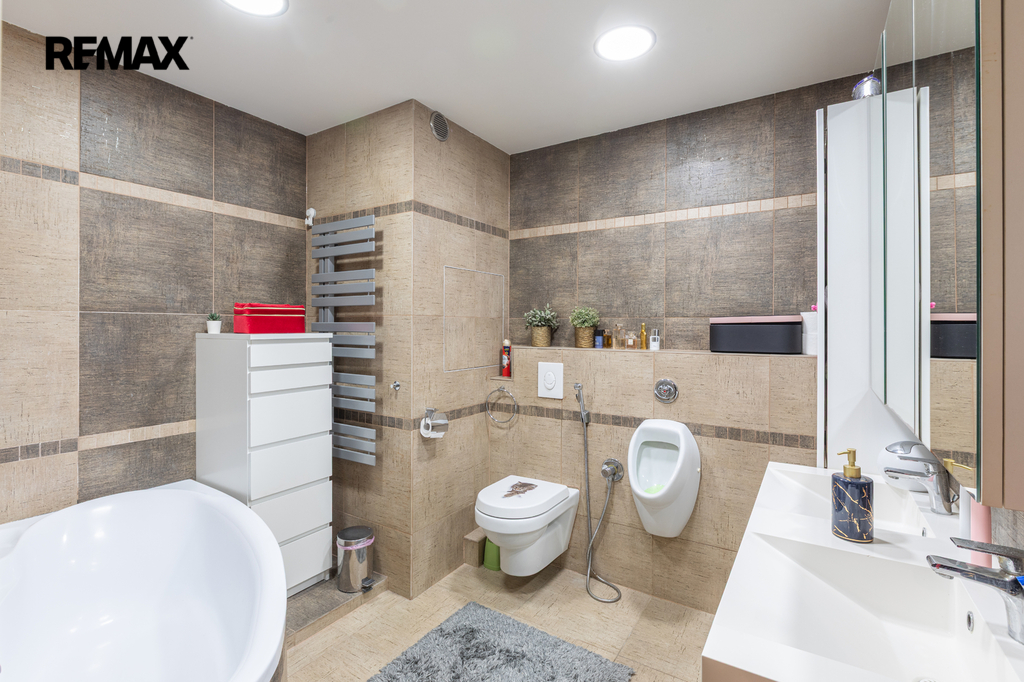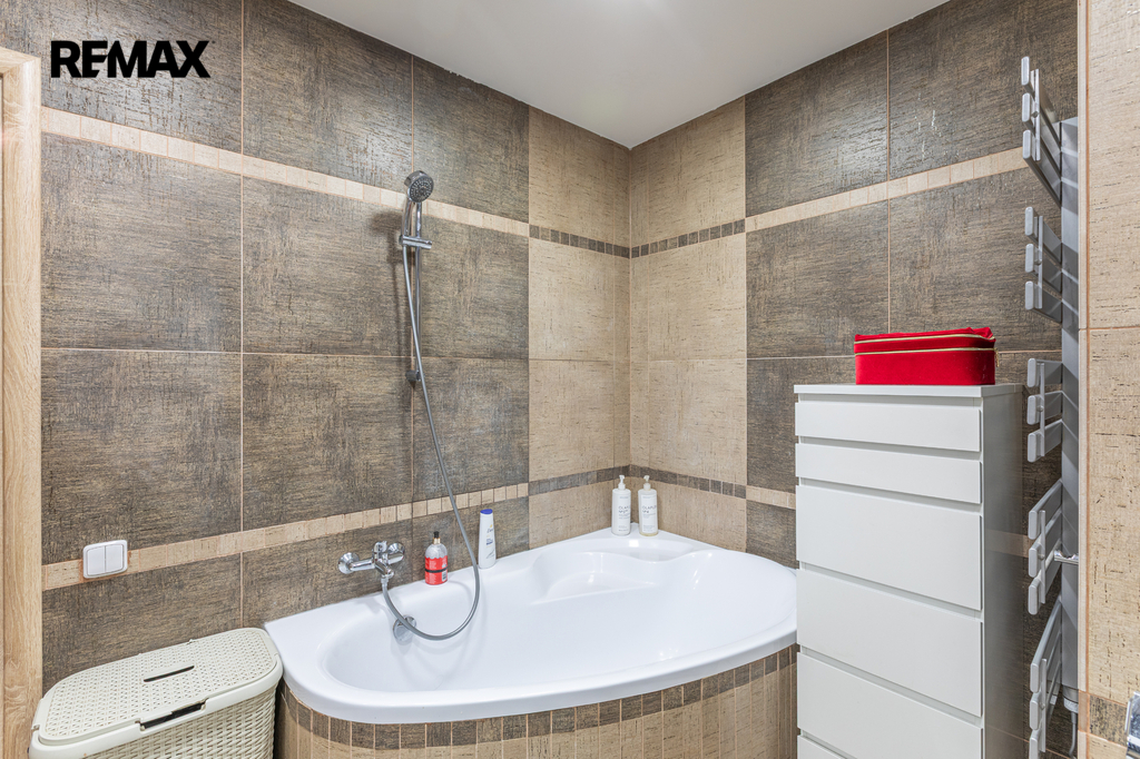V bytě je velké množství úložného prostoru, díky několika vestavěným skříním. Krásná kuchyňská linka s ostrůvkem a kvalitními vestavěnými spotřebiči Vás také jistě zaujme.