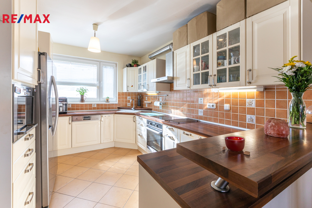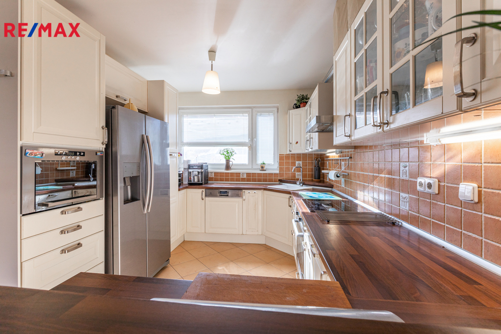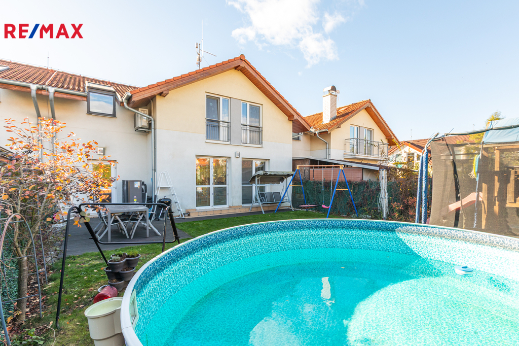 Dvoupodlažní zděný řadový dům (o užitné ploše 142 m2 + úložný prostor na půdě) byl postaven v roce 2009 a disponuje v přízemí dobře řešenou světlou kuchyní s navazující jídelnou a obývacím pokojem se vstupem na zahradu s terasou, dětskými prvky a bazénem. Dále je vstupní předsíň s vestavěnou skříní, WC s umyvadlem, komora a velká garáž 18 m2.
