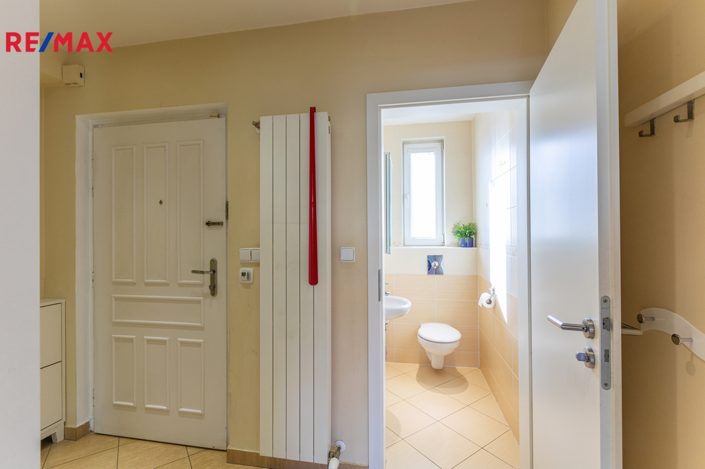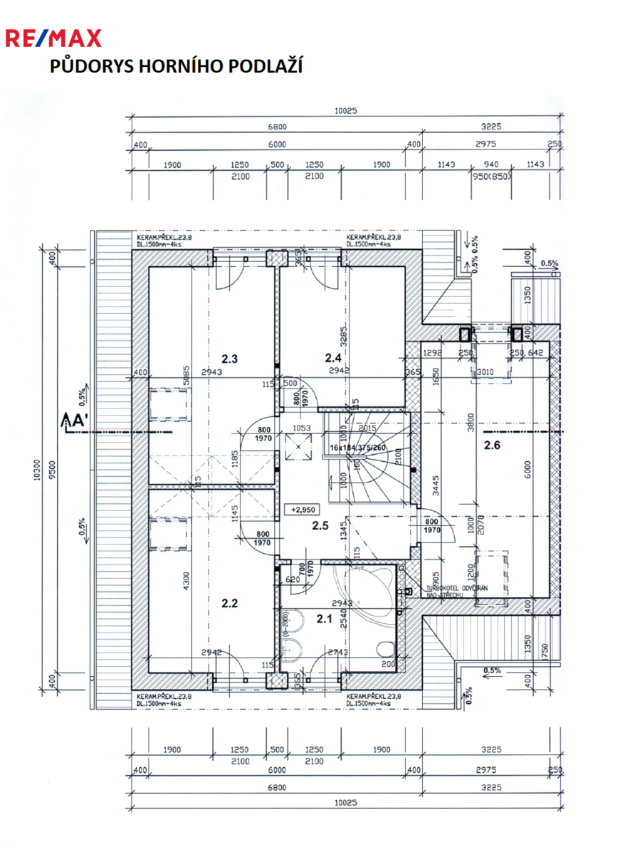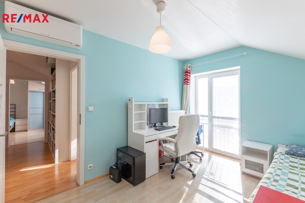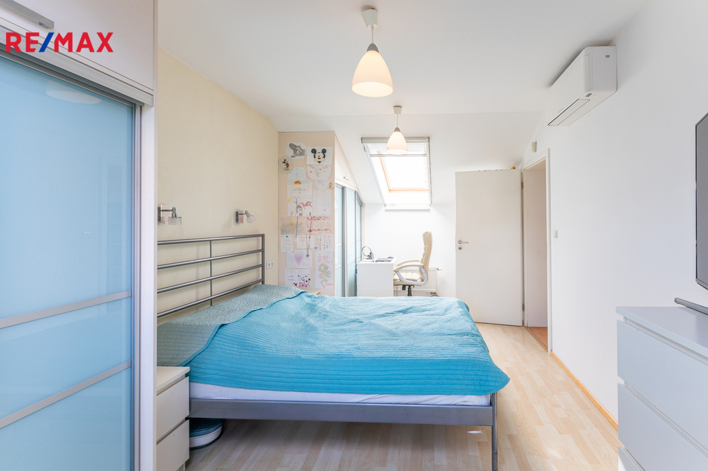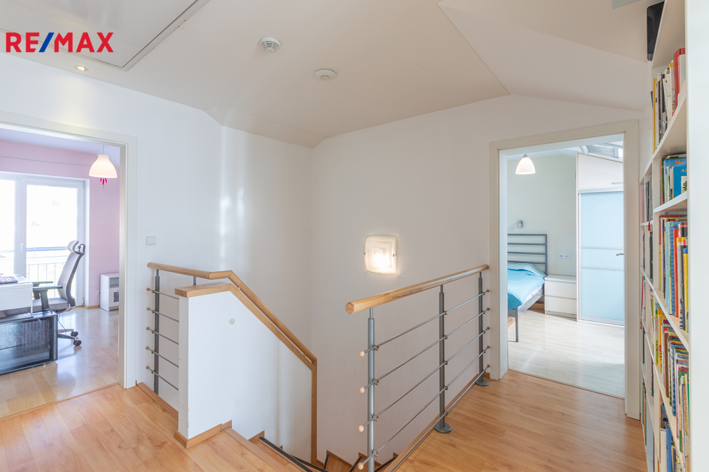 V patře domu jsou 4 samostatné klimatizované ložnice, hala a velká koupelna s podlahovým topením. Ve všech ložnicích jsou praktické vestavěné skříně, další úložný prostor je na půdě.