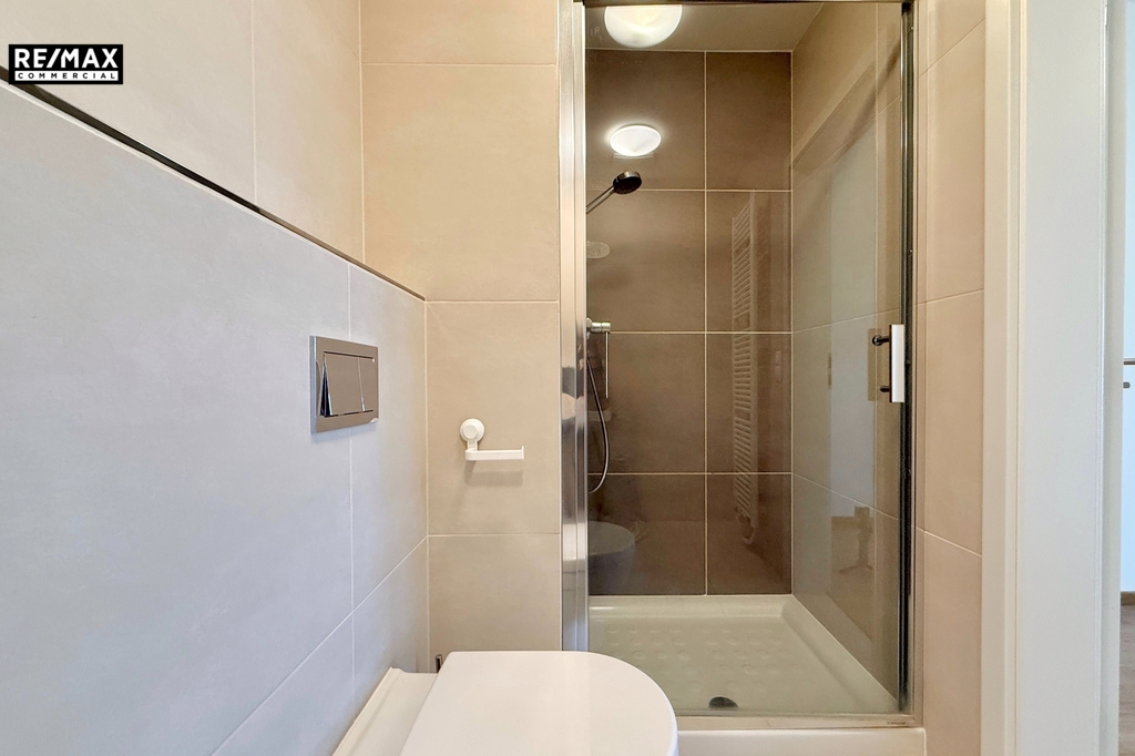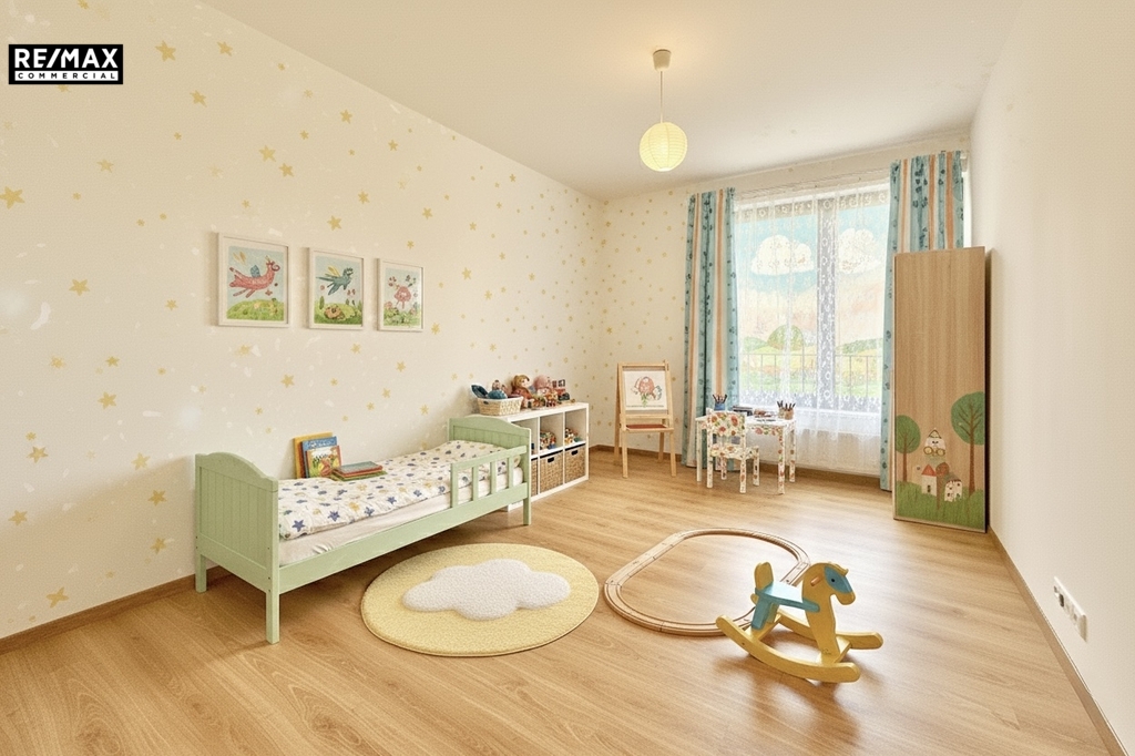 V bytě se dále nachází dvě samostatné ložnice – hlavní ložnice má vlastní koupelnu se sprchovým koutem, což dodává bytu ještě větší komfort. Na chodbě je prostor pro pračku a sušičku. Podlahy v obytných místnostech jsou pokryty plovoucí podlahou v dekoru dřeva, která dotváří teplo domova, v koupelnách a na chodbě je elegantní dlažba. K bytu náleží také velký sklep a garážové stání v 1. PP domu.