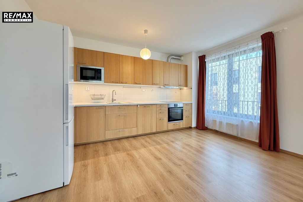 Srdcem bytu je prostorný obývací pokoj s kuchyňským koutem o výměře téměř 40 m². Kuchyňská linka o délce přes čtyři metry nabízí dostatek prostoru pro vaření i ukládání věcí, a je vybavena kvalitními spotřebiči značky Electrolux – indukční varnou deskou, digestoří, lednicí s mrazákem, mikrovlnnou troubou i myčkou. Okno v kuchyni poskytuje příjemný výhled do zeleně sousedních zahrad, takže i každodenní vaření se stává radostí.