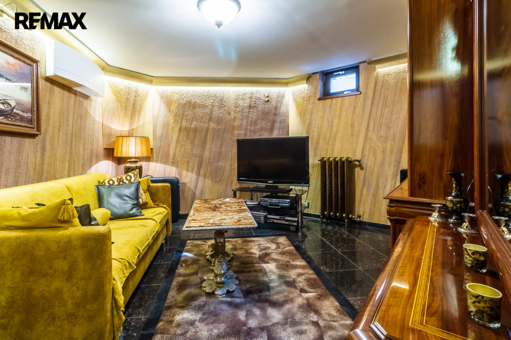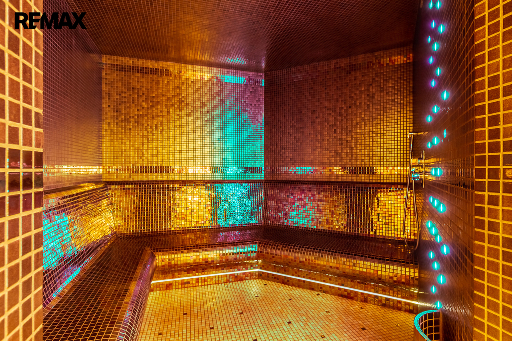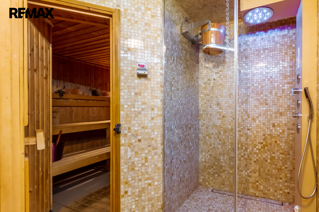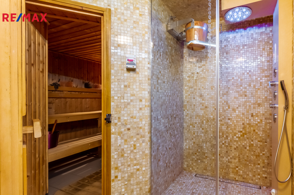 V suterénu (79 m²) se nachází fitness a relaxační místnost s klimatizací, finská a turecká sauna, sprcha a samostatné WC – ideální zázemí pro soukromý wellness.