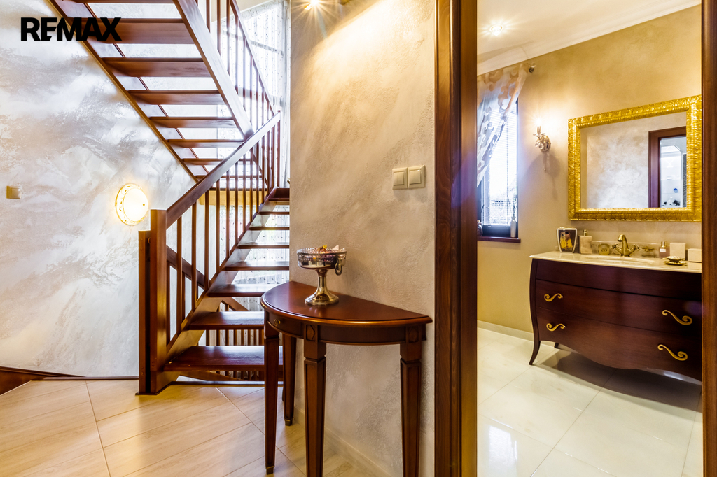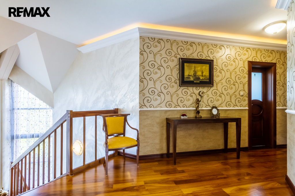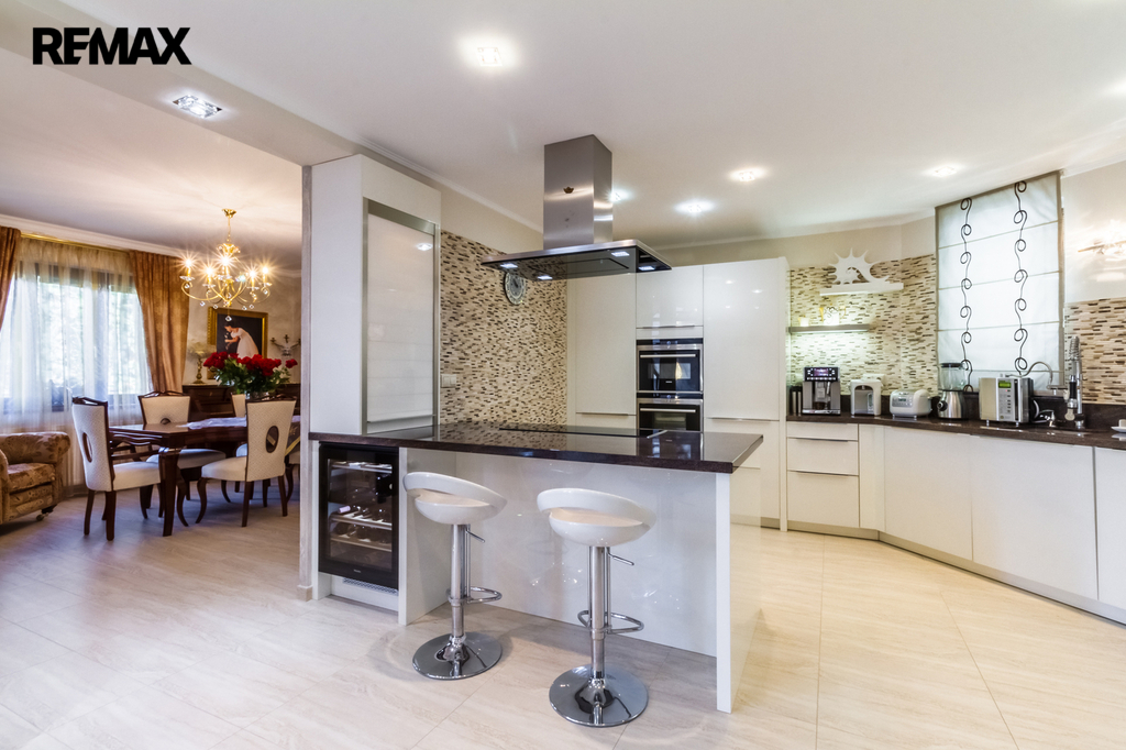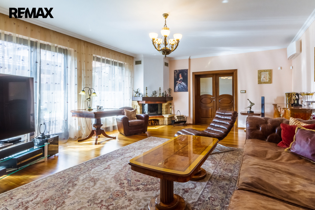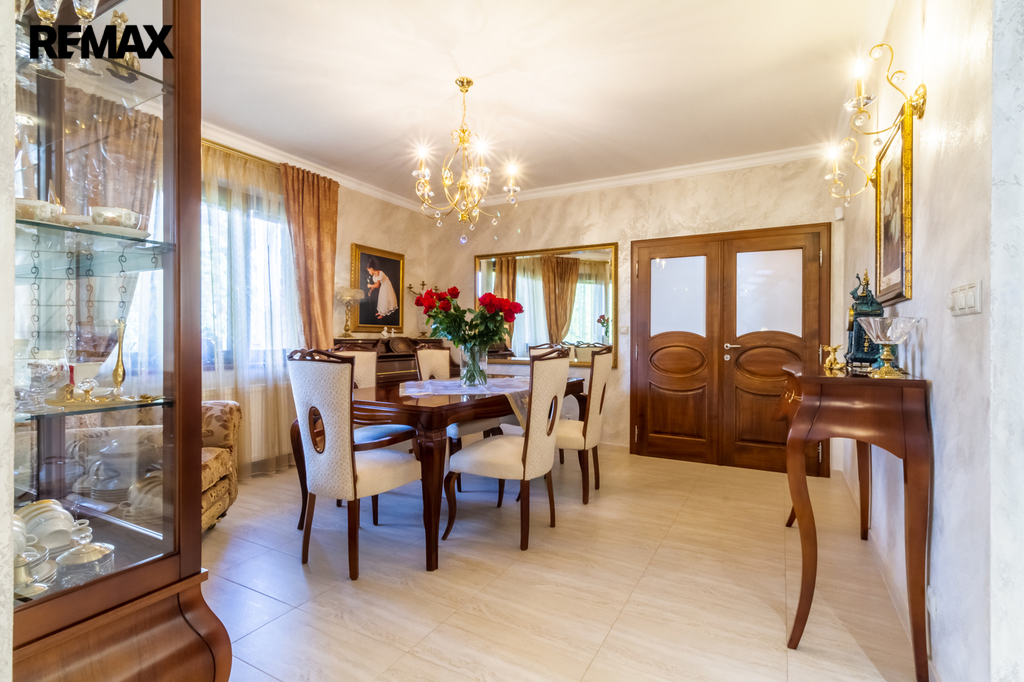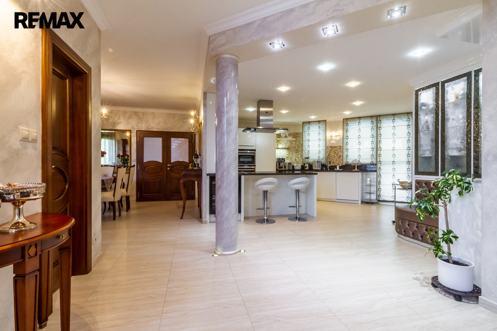 Interiér domu nabízí podlahovou plochu 340 m², kterou doplňuje dalších 81 m² exteriérových prostor – zimní zahrada, zahradní sklad, dvougaráž a balkon.