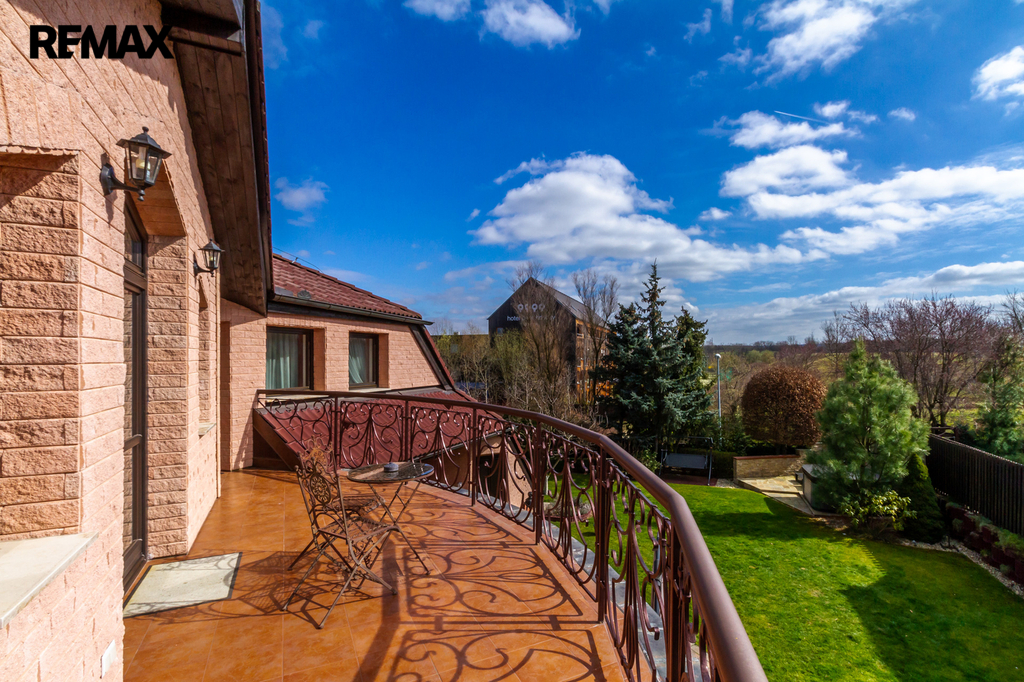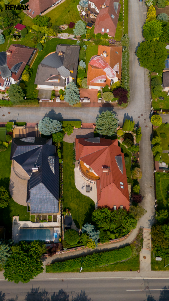 Pečlivě upravená zahrada s prvky krajinářského designu zajišťuje soukromí i prostor pro odpočinek. Součástí je okrasný rybník, terasa pro letní posezení, dvojgaráž a další parkovací místa. Komfort a bezpečnost zajišťují automatická vrata a kamerový systém.