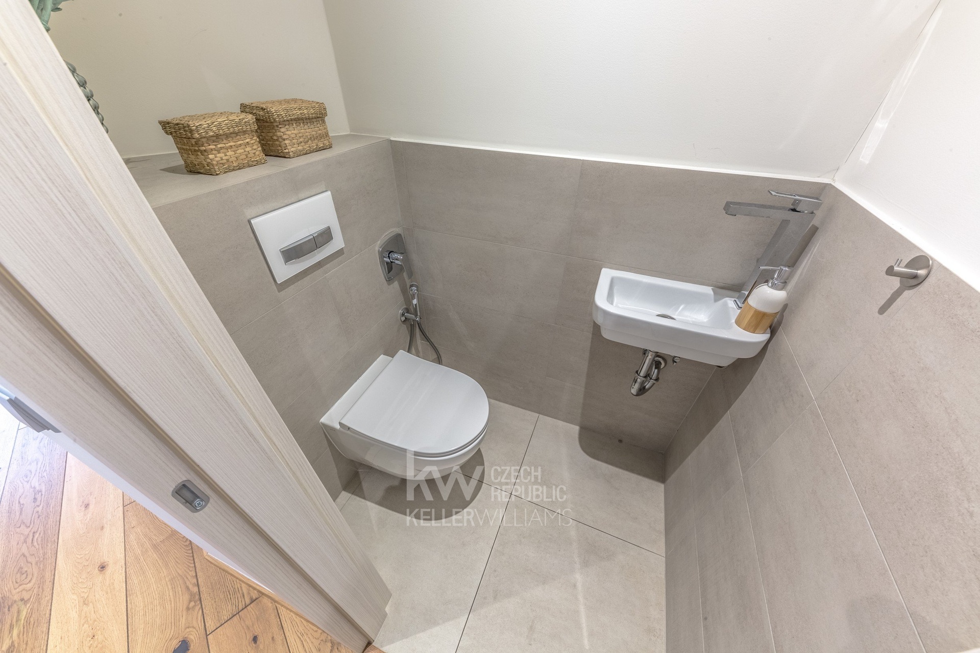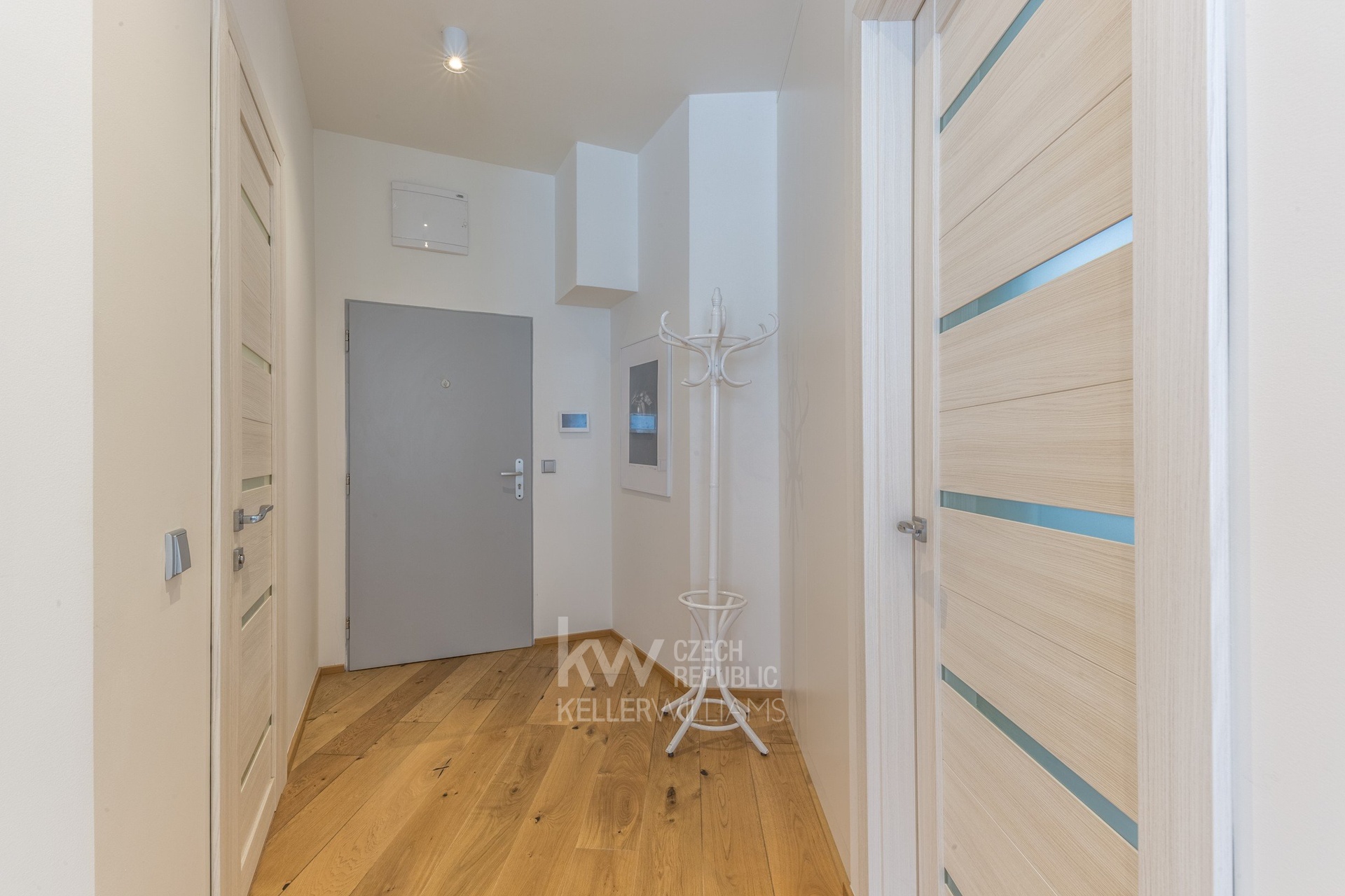 Byt je částečně zařízen – nová kuchyňská linka je vybavena vestavnými spotřebiči Siemens, v předsíni jsou decentní vestavné skříně navržené tak, aby nenarušovaly čistý design interiéru. V koupelně je prostor pro pračku i sušičku.