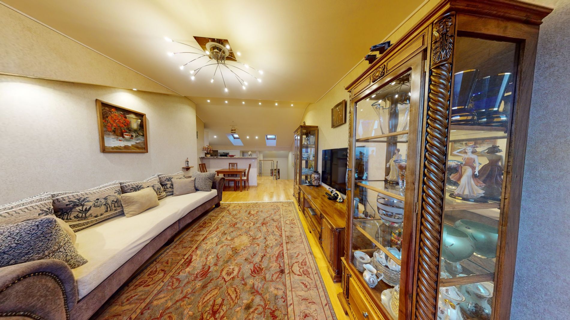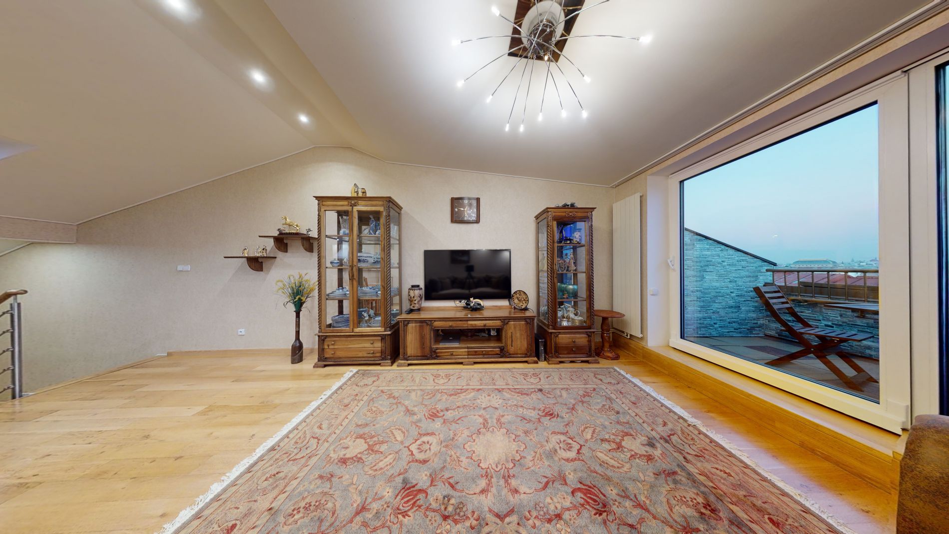 přírodní dubové parkety, ručně vyráběný nábytek z přírodního ořechu, kuchyň s přírodním africkým kamenem, bezpečnostní vstupní dveře na míru, klimatizaci v obývacím pokoji (chlazení i vytápění), Smart Home systém pro regulaci vytápění