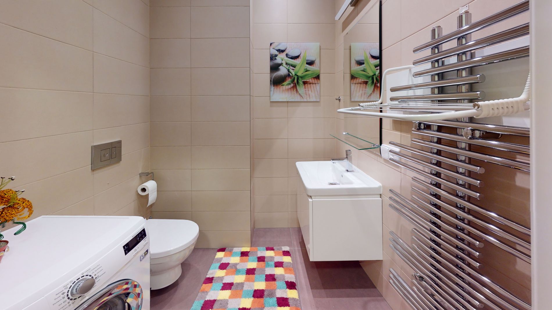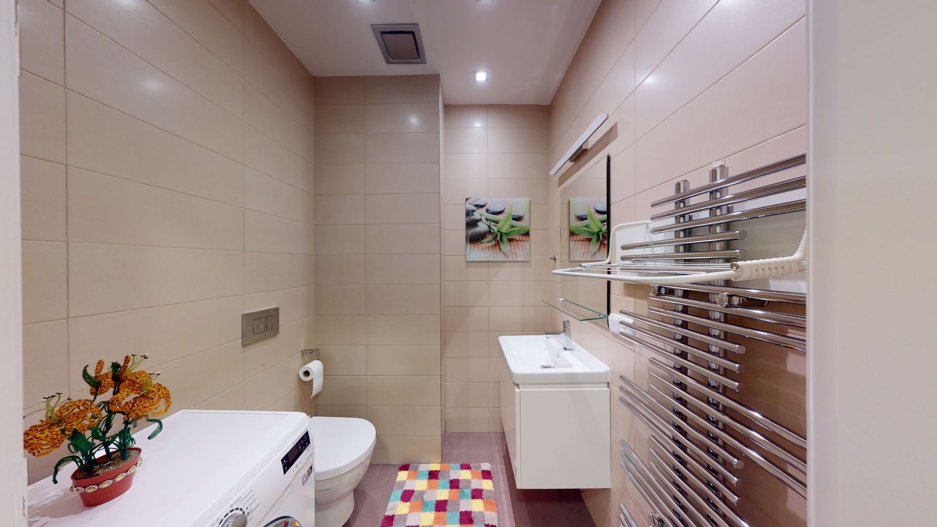 indukční varná deska, horkovzdušná trouba, myčka nádobí, digestoř, lednice. Sanitární vybavení je značky JIKA.