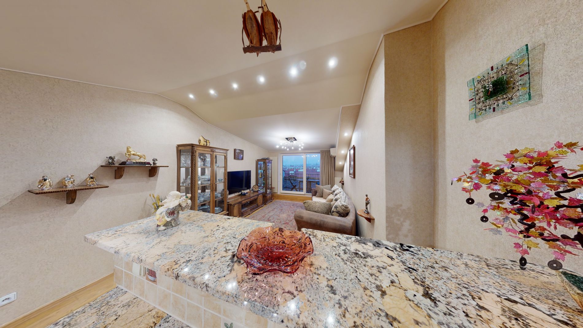 Dominantou bytu je prostorný obývací pokoj s moderní kuchyní cca 33 m and sup2; a vstupem na balkon / terasu cca 7,5 m and sup2;, odkud se otevírá jedinečný výhled na město.