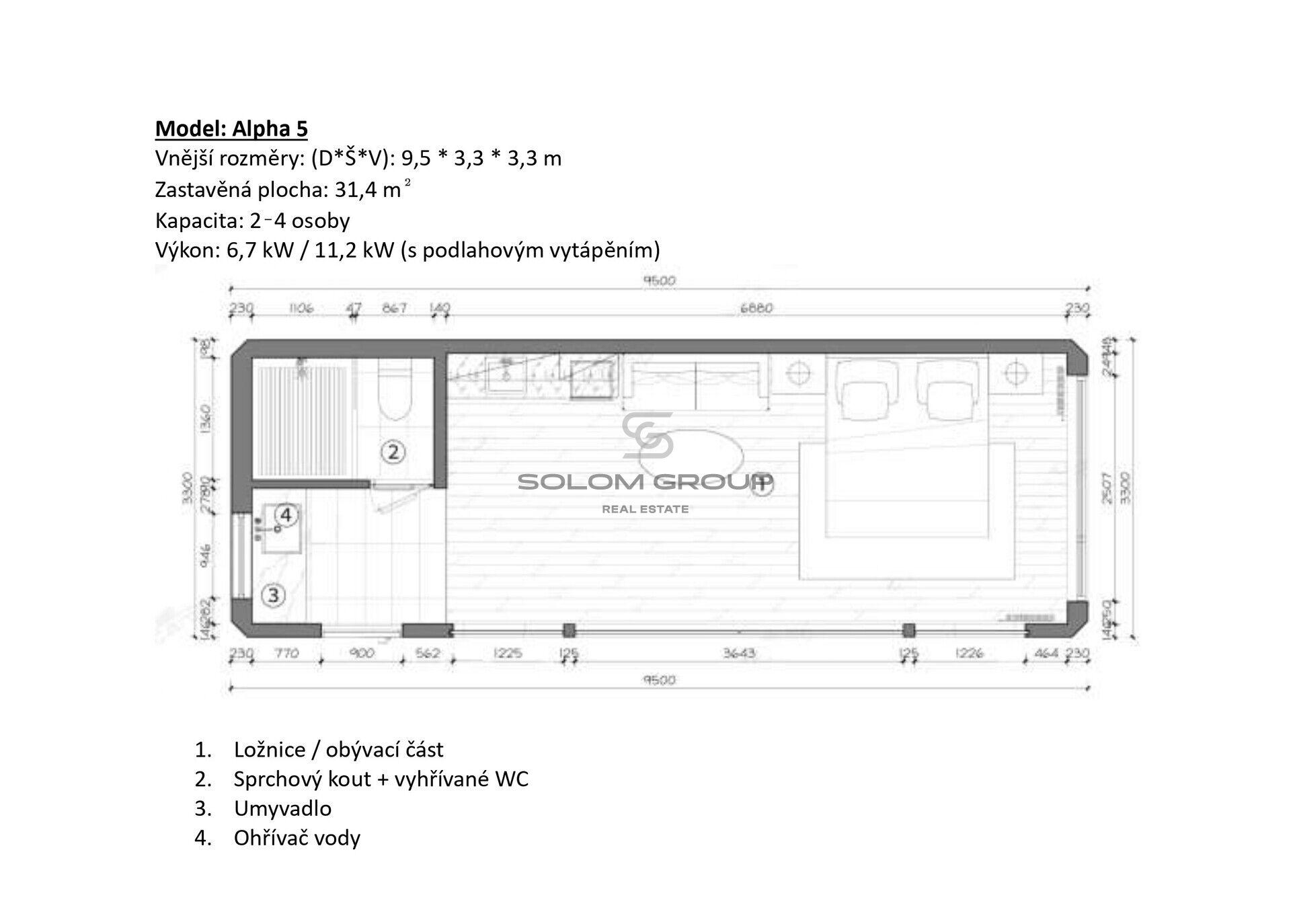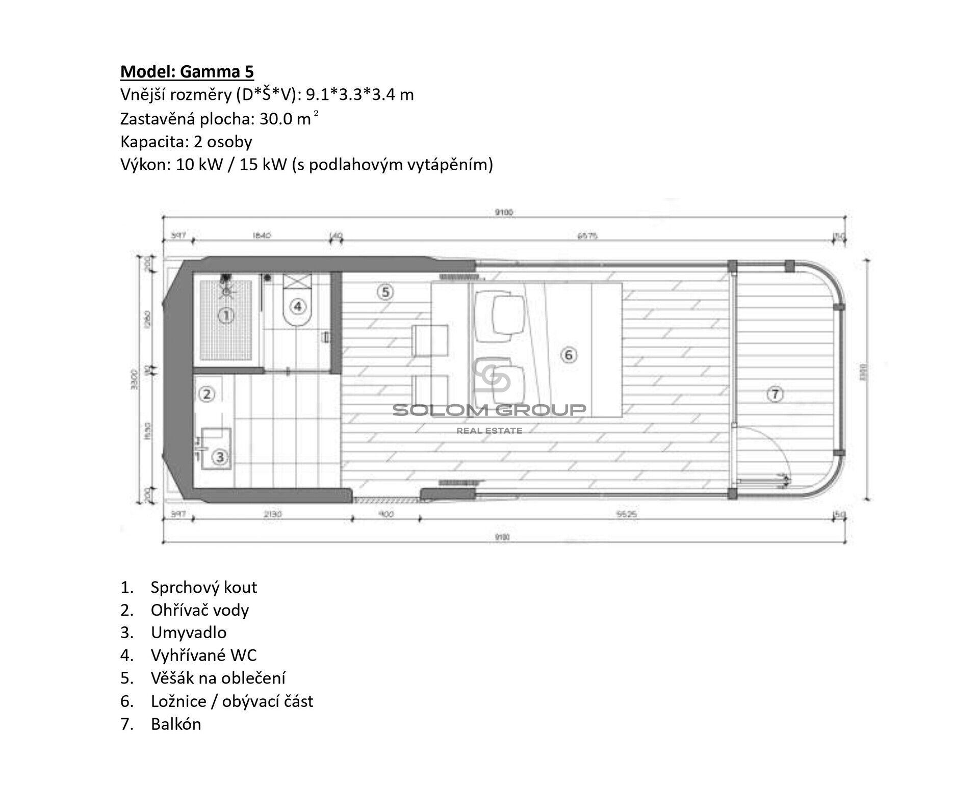 Rozměry cca 9–9,5 m délka × 3,3 m šířka, plocha cca 30–32 m² / kus
