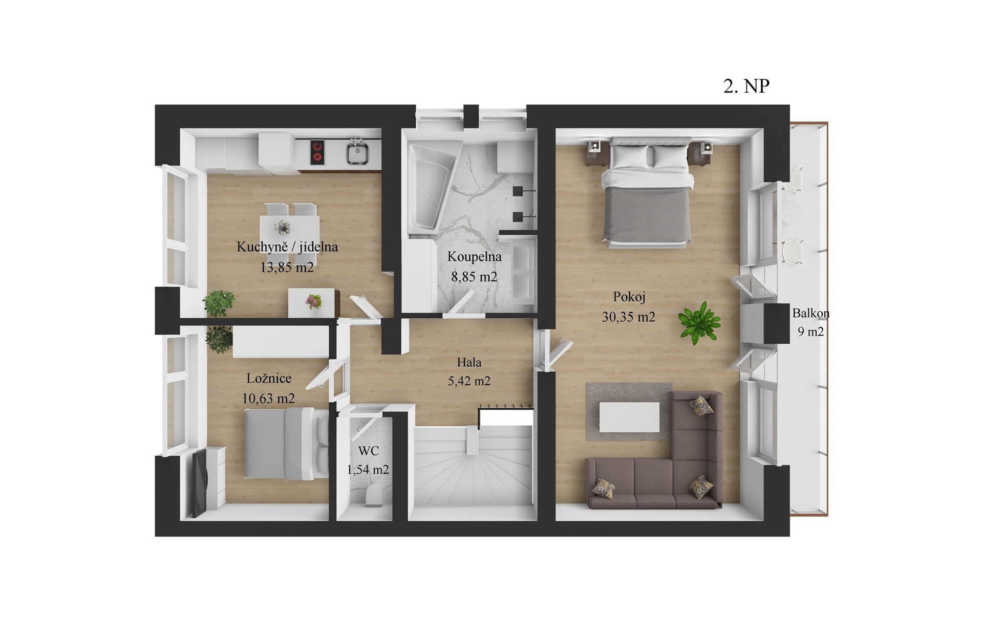 Dispozice domu je navržena s důrazem na funkčnost, dostatek přirozeného světla a dlouhodobou variabilitu. Každé podlaží poskytuje dostatek prostoru i soukromí, přičemž interiér působí vzdušně, klidně a nadčasově. Dům se tak snadno přizpůsobí individuálním potřebám budoucích majitelů.