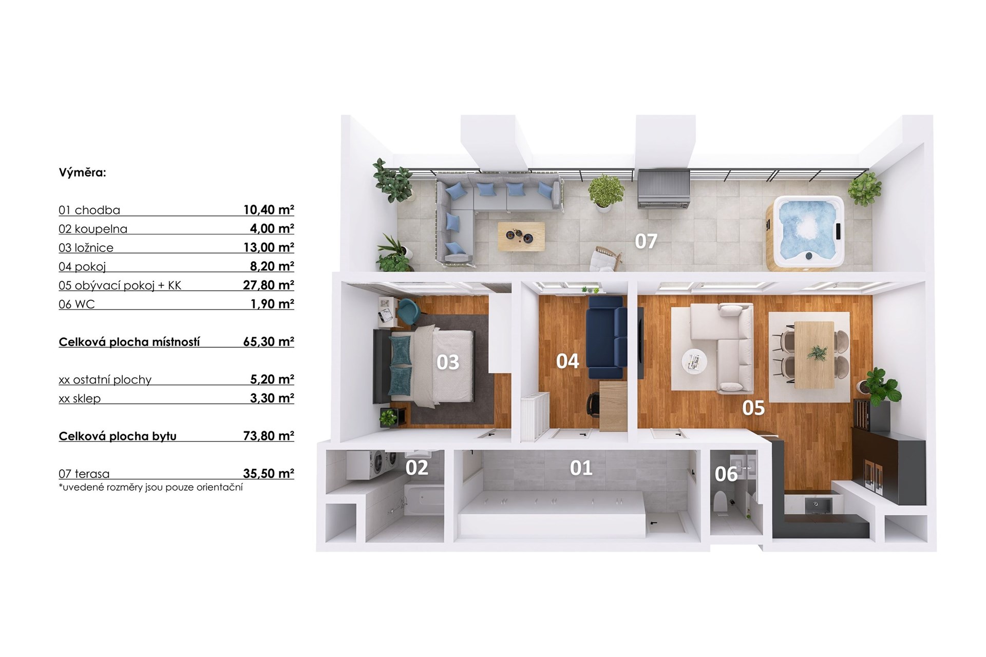 Dominantou bytu je prostorná terasa táhnoucí se po celé délce bytu, která se stane vaším osobním útočištěm nad městem. Součástí je bioklimatická pergola (17 m²) se screenovými roletami a integrovaným LED osvětlením, vše ovladatelné dálkově či mobilní aplikací. Připraveno je také kompletní zázemí pro vířivku – vývod vody, zásuvky, osvětlení i zpevněná plocha. A aby bylo vaše léto dokonalé, součástí prodeje je nová vířivka Intex Deluxe pro 4 osoby.