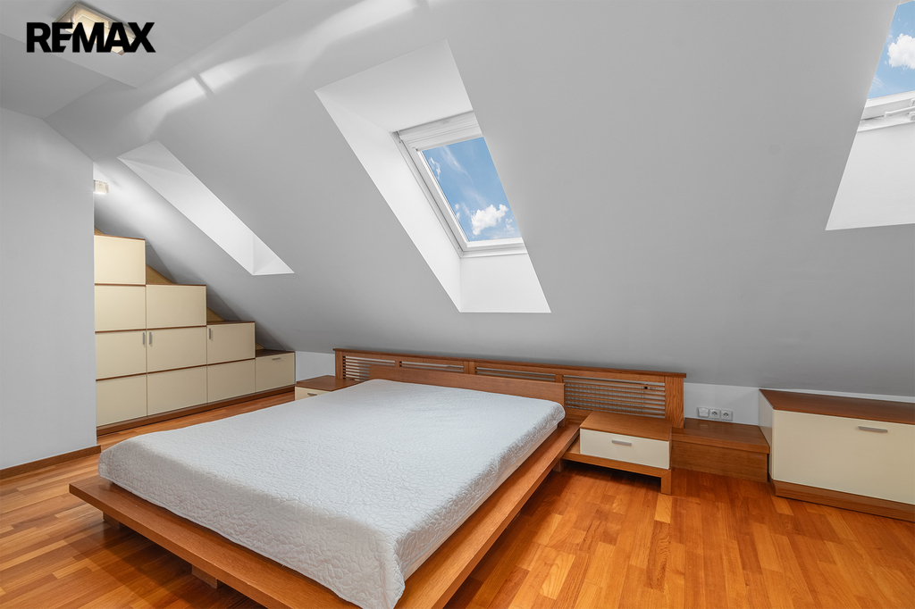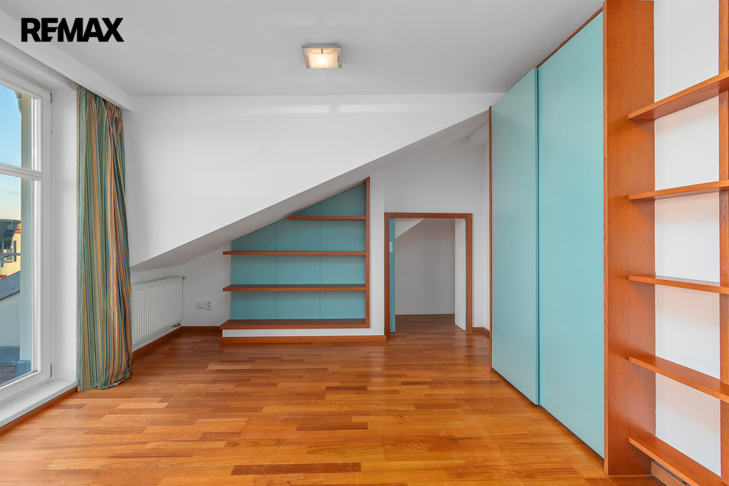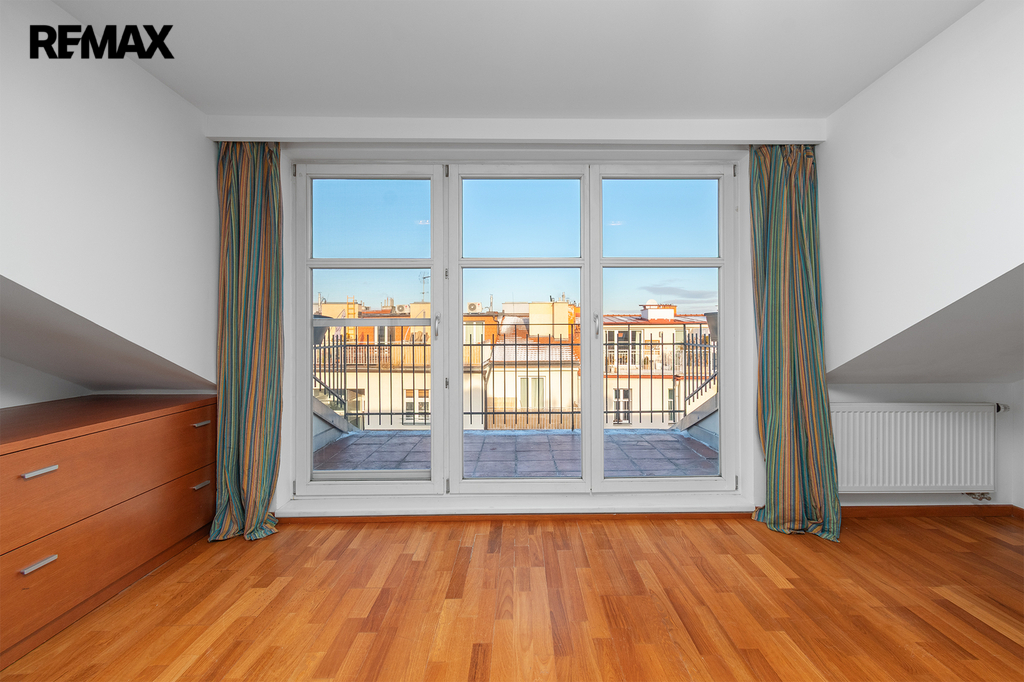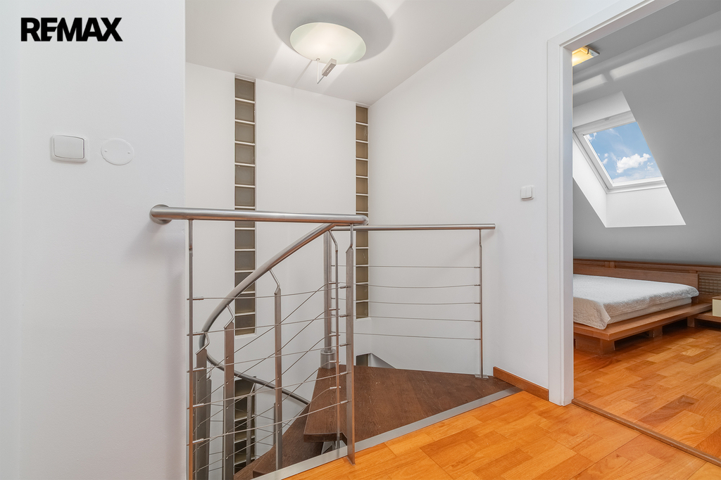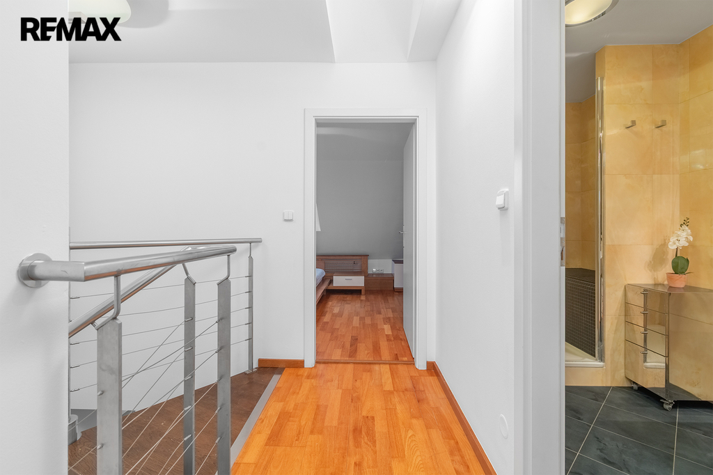 Po schodišti se dostanete do horního patra, které je pojato jako klidová zóna poskytující maximální soukromí a klid. Nachází se zde ložnice se šatnou a další samostatný pokoj, ze kterého je francouzským oknem přímý vstup na terasu, s výhledem do klidného vnitrobloku. Ideálně je tak rozšířen užitný prostor bytu, který se stává místem, kde může den začínat ranní kávou a končit klidným večerním posezením. Maximální pohodlí pak zajišťuje druhá koupelna se sprchovým koutem a toaletou.